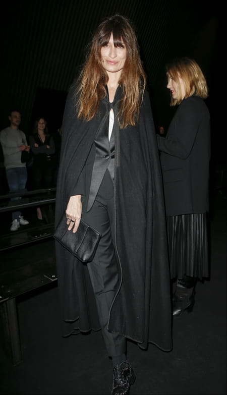 Il a neigé ces derniers jours à New York et les personnalités invitées aux défilés ont dû se protéger du froid tout en restant stylées. Caroline de Maigret a trouvé la bonne technique et a encore une fois prouvé son sens de la mode au show d'Alexander Wang. Elle a ingénument choisi de porter une longue cape noire par-dessus sa tenue. On pourrait même parler d’un poncho, puisque le vêtement semble s’enfiler par le col. En effet, c’est une broderie qui relie les deux pans du vêtement. Sous ce manteau, on découvre un tailleur-pantalon. Une bande de tissu satiné compose le col de la veste tandis que le bas de l’ensemble semble remonter jusqu’à la taille. On remarque que le mannequin a préféré porter un discret top sous le blazer plutôt que de laisser l’encolure lui faire un décolleté. Ce costume évoque un style masculin-féminin que Caroline de Maigret affiche souvent et qui lui va si bien. Chaussettes noires et pochette noire, on observe que ce ne sont pas les accessoires qui cassent l’uniformité et la sobriété de la tenue. En effet, la Française stylée a simplement misé sur les détails argentés de ses chaussures. Il manque peut-être une touche de couleur à ce look, mais il est plutôt chic. On retient en tout cas, l’idée de la cape qui vient féminiser le tailleur.