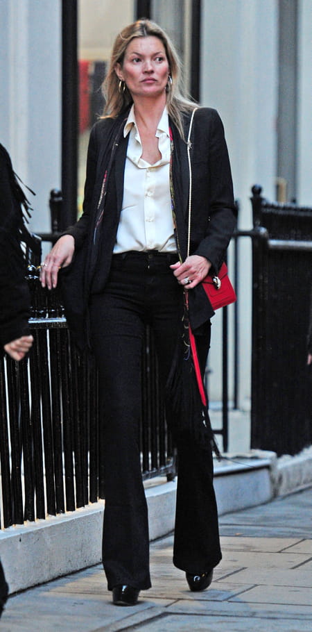 41 ans au compteur et pourtant, La Brindille continue de fasciner. Ce 24 mars 2015, cette dernière a été aperçue dans les rues de Londres en pleine virée shopping chez Celine et Christian Louboutin. Et pour l’occasion, le mannequin était plutôt bien apprêté : en effet, Kate Moss a laissé au placard ses tenues rock, pour leur préférer un look de working girl. Arborant un tailleur pantalon noir très bien coupé, elle a toutefois opté, à la place du sempiternel pantalon droit, pour un flare : voilà un choix audacieux, qui rentre parfaitement dans la tendance années 70 prévue pour le printemps-été 2015 ! Allure workwear oblige, le top model a mixé le tout avec une chemise blanche déboutonnée sur le haut, qu’elle a négligemment fait blouser dans son pantalon. Pour allonger sa silhouette, elle s’est juchée sur des très hauts talons à plateforme en cuir verni noir, parfaits avec son flare. Enfin, en guise d’accessoires, elle s’est parée d’un foulard en satin imprimé, assorti à son sac à main rouge – histoire de mettre un peu de couleur – quand cheveux lâchés au vent et créoles aux oreilles ponctuent l’ensemble. Kate n’a pas fini de nous inspirer…
