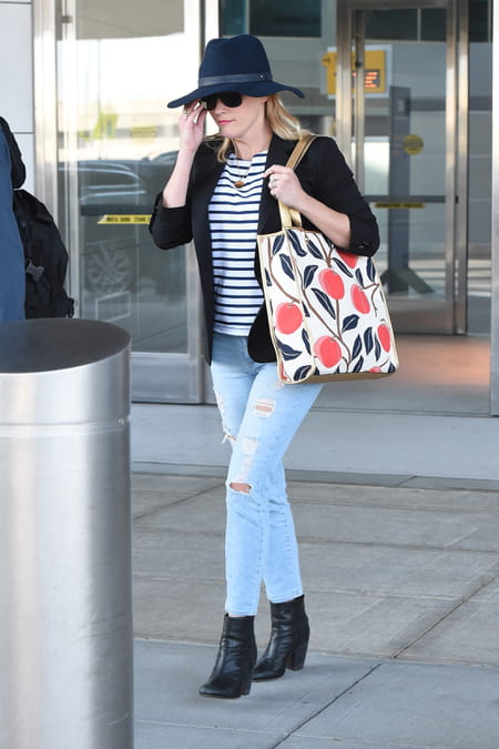 On ne sait si Reese Witherspoon a su s'entourer de stylistes de choix ou si elle possède tout simplement un sens inné de la mode, mais l'actrice américaine faisait à nouveau preuve de bon goût hier à New York. Adepte de la simplicité, la blonde de 39 ans choisissait de revêtir de bons basiques réactualisés alors qu'elle apparaissait à l'aéroport JFK le 3 mai 2015. Sa tenue de voyage se composait d'un jean slim clair déchiré sur les cuisses – la petite touche destroy moderne – associé à une marinière sans artifices. À cette base classique mais efficace s'ajoutait un blazer noir et une paire de bottines en cuir assorties qui rendaient l'ensemble chic et lui conféraient une allure de working-girl contemporaine. Si l'actrice était tout à fait élégante dans cette tenue, une petite prise de risque vestimentaire aurait tout de même été appréciée, en osant par exemple un pardessus léger ou une paire de sandales lacées à talons. Histoire de pimenter le tout, l'interprète de Cheryl Strayed dans le biopic Wild portait un panama bleu marine à bords mous, un accessoire tendance qui rehausse n'importe quel look et s'adapte aussi bien à une garde-robe d'hiver qu'à une garde-robe estivale. Enfin, un tote bag à l'imprimé fruité égayait la tenue monochrome de Reese Witherspoon, qui nous démontrait une fois de plus que les basiques sont une valeur sûre !