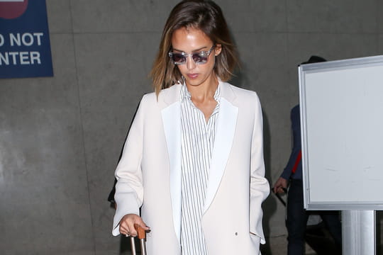 C'est à l'aéroport de Los Angeles, de retour du Met Gala 2015 que Jessica Alba a fait une apparition remarquée le 5 mai. L'actrice au style pointu, réputée pour ses looks toujours très tendance et légèrement boyish, a foulé le sol californien dans une tenue qui semble être son nouvel uniforme pour voyager. A 34 ans, la jeune maman adepte de pièces structurées et quelque peu oversized portait un jean droit délavé roulé sur les chevilles, pour lui donner une allure 7/8 et mettre encore plus en valeur ses ballerines pointues couleur nude, indispensables cette saison. Au-dessus de son chemisier à fines rayures verticales, la it-girl portait un manteau ivoire très structuré signé Gerard Darel, agrémenté d'un col cranté blanc et de poches frontales ; la pièce phare de son look qui permettait d'équilibrer les volumes et d'apporter la touche de modernité qui va bien. Son sac à main Kalifornia en cuir gommé de Kenzo faisait un rappel de couleurs dans sa tenue monochrome et attirait l’œil avec ses détails argentés si caractéristiques. Enfin, pas de chapeau sur la tête de Jessica Alba, mais une paire de lunettes de soleil à verres miroirs pour se donner une allure décontractée inimitable. Encore une fois, l'actrice a bon sur toute la ligne !