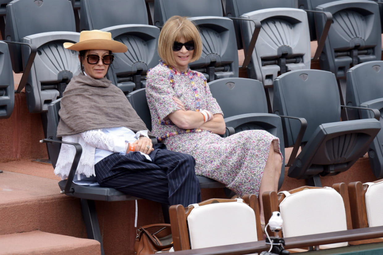La papesse de la mode éclipsait toutes les spectatrices du tournoi de Roland-Garros 2015, habillée d'un tailleur en tweed Chanel haute couture printemps-été 2015, composé d'une jupe droite tombant sous le genou et d'un boléro à manches courtes ourlé de fleurs multicolores. Le summum de l'élégance !