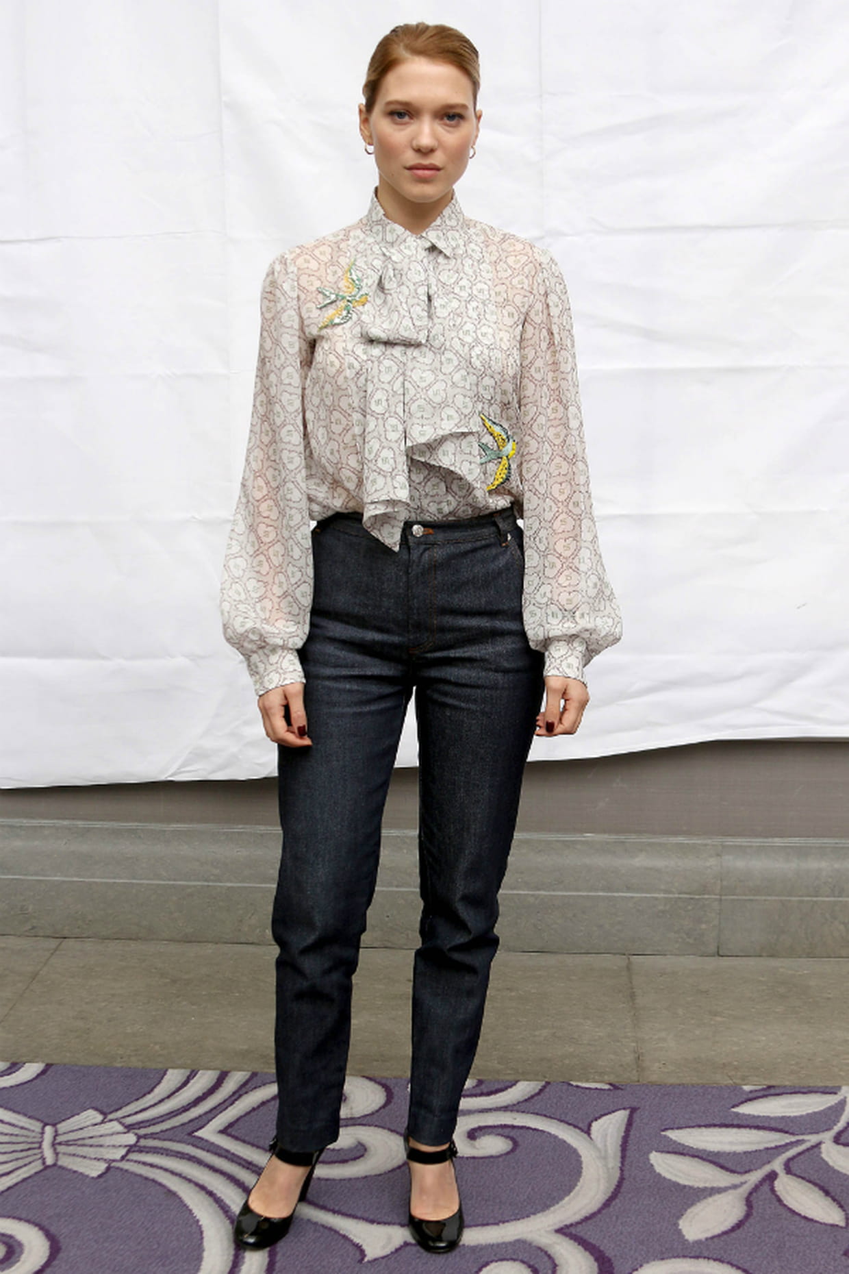 Lea Seydoux portait un chemisier à col lavallière et un jean cigarette brut pour la conférence de presse de Spectre à Londres, Angleterre le 23 octobre 2015