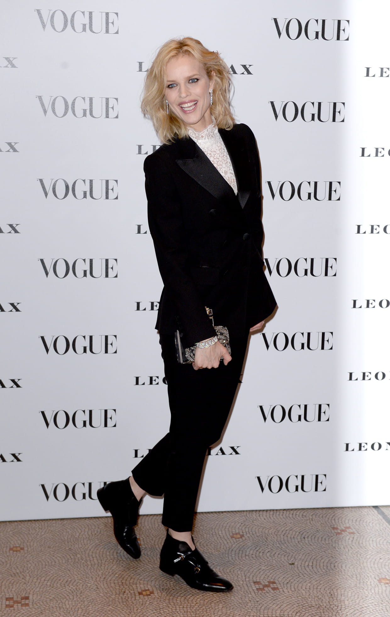 L'ex mannequin tchèque Eva Herzigova en smoking pantalon 7/8ème noir à la soirée d'inauguration de l'exposition "Vogue 100 : A Century of Style" à Londres