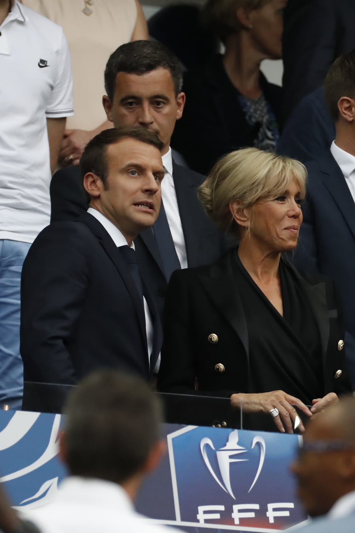 Brigitte Macron en haut noir cache-cœur au Stade de France à Saint-Denis le 27 mai 2017.