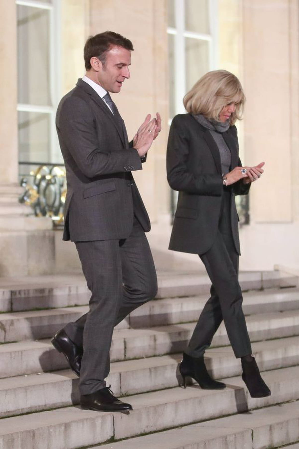 Brigitte Macron en ensemble gris avec Emmanuel Macron à l'Élysée le 18 décembre 2023.