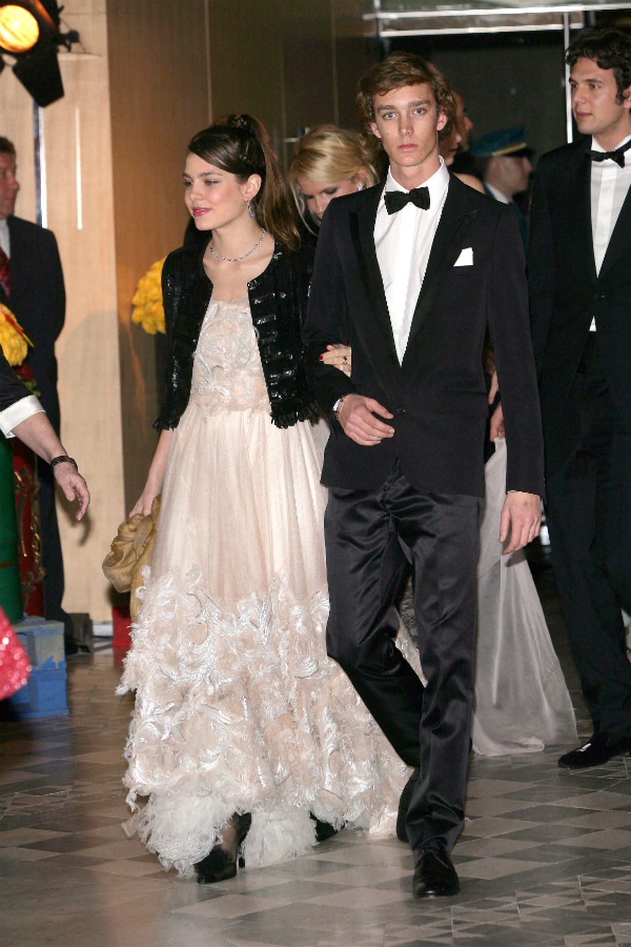 Charlotte Casiraghi en robe crème brodée de plumes avec son frère Pierre Casiraghi au bal de la Rose à Monaco le 25 mars 2006.