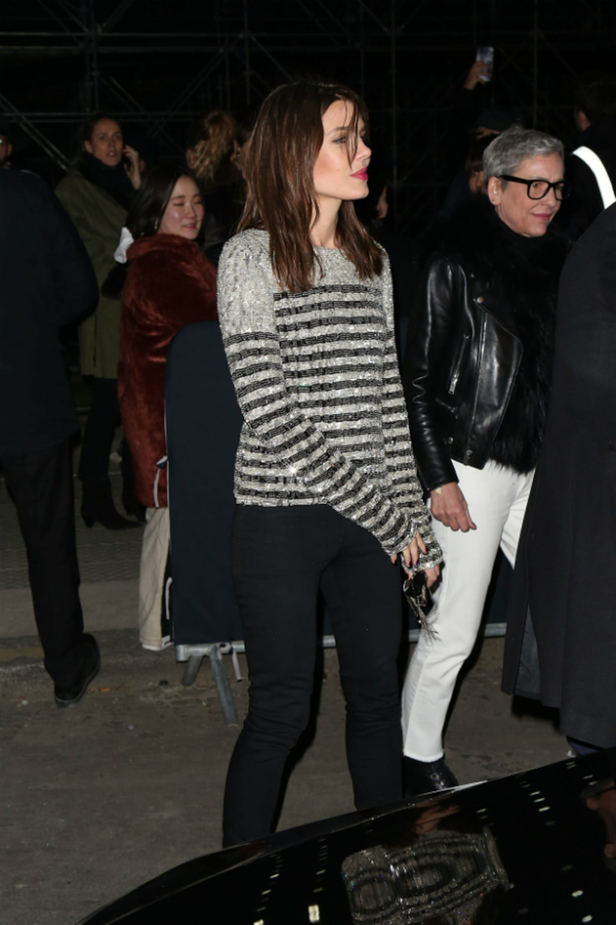 Charlotte Casiraghi en pull marinière pailletée et jean noir au défilé Saint Laurent pendant la Fashion week automne-hiver 2018-2019 à Paris le 27 février 2018.