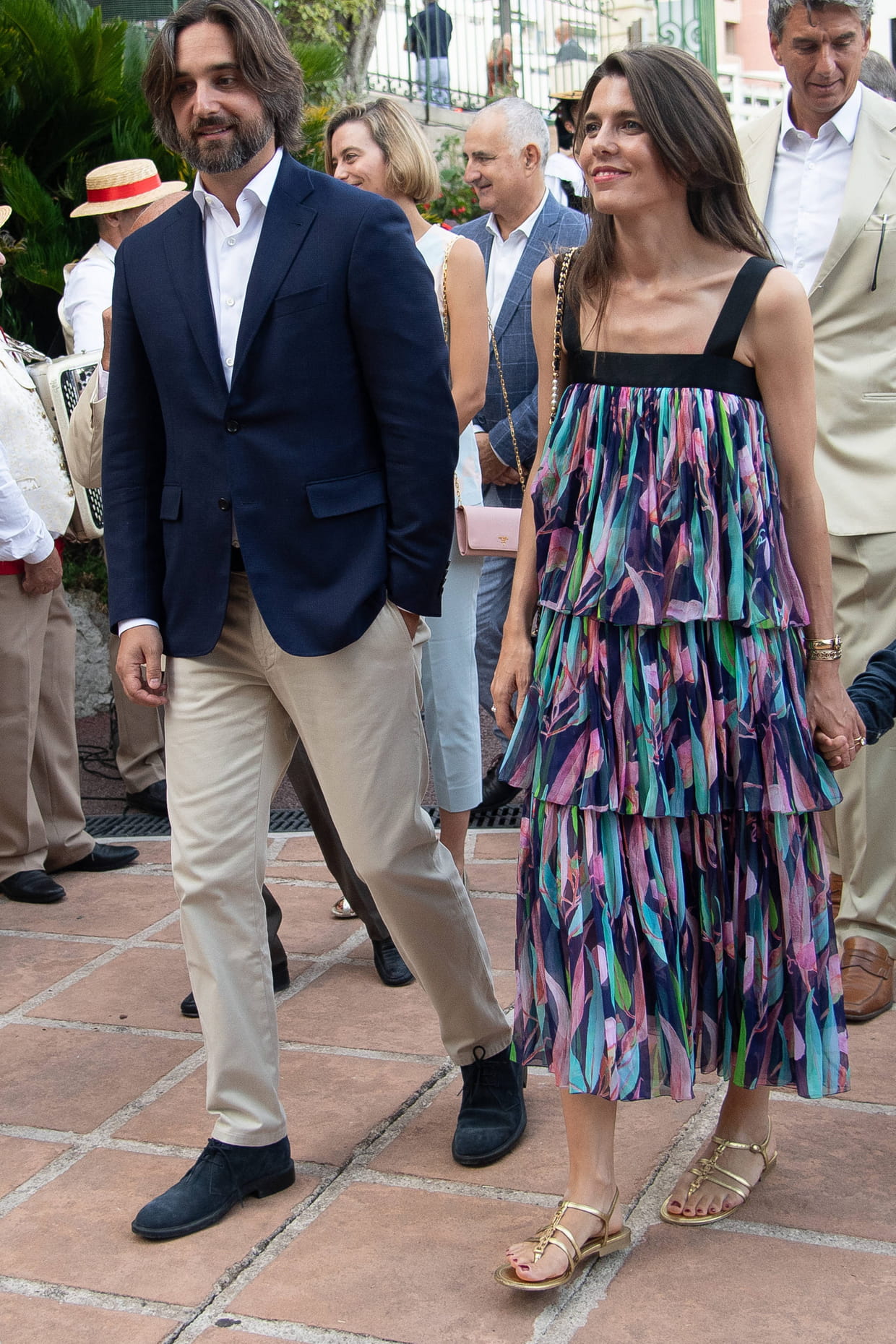 Charlotte Casiraghi en robe longue fluide colorée lors d'un pique-nique royal à Monaco le 9 septembre 2023.