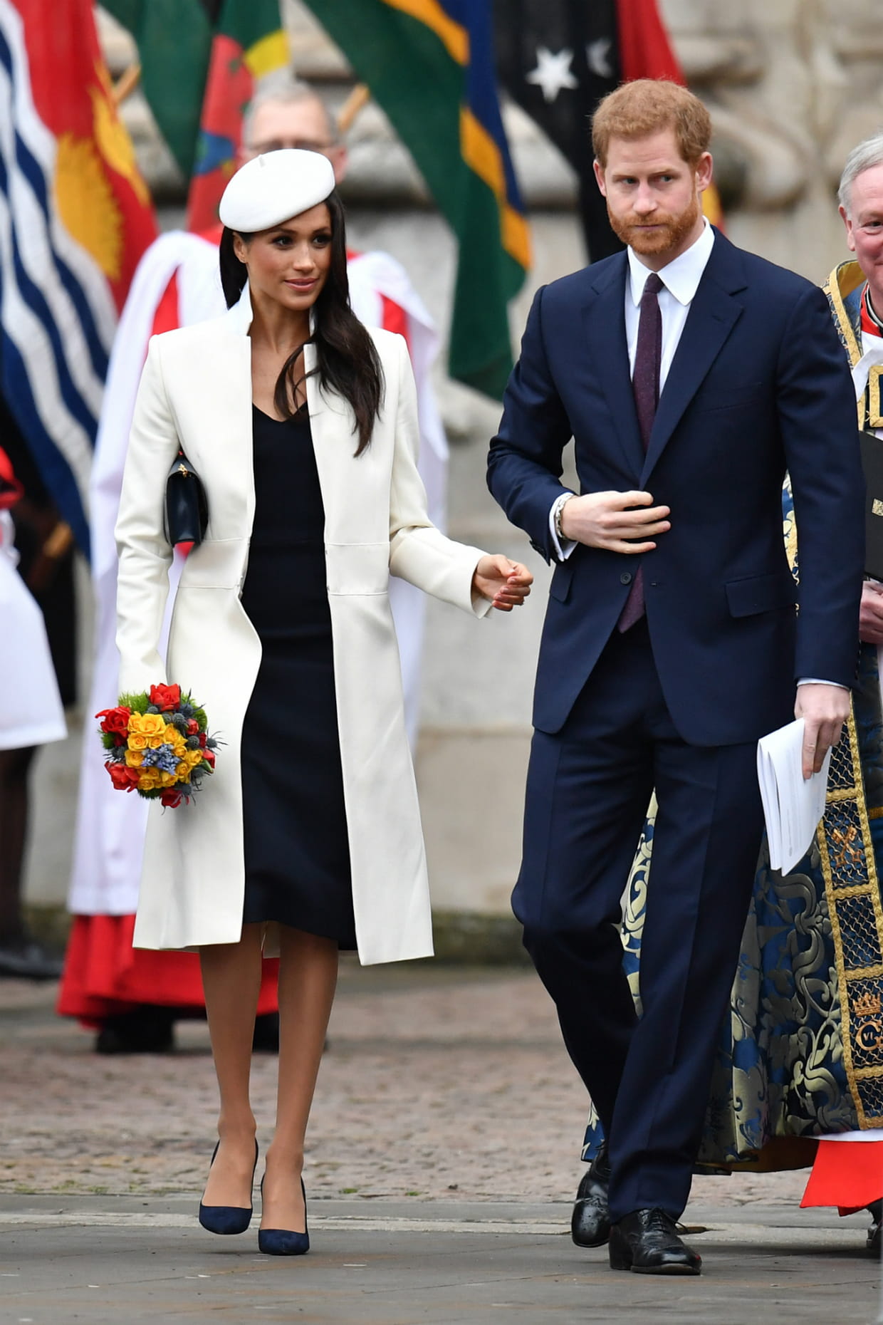Meghan Markle en manteau blanc et chapeau assorti et le Prince Harry à l’abbaye de Westminster à Londres le 12 mars 2018.