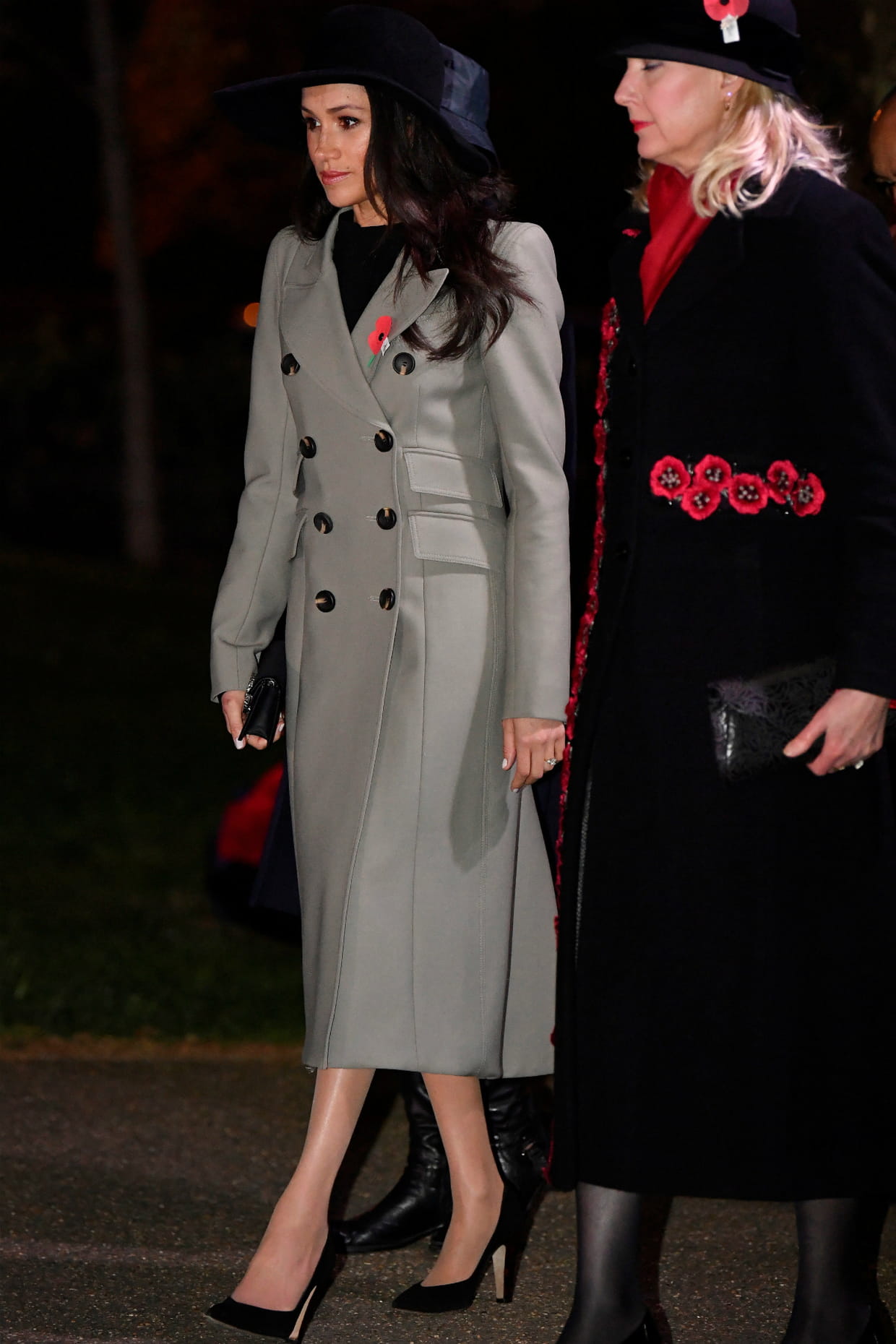 Meghan Markle en manteau gris à boutons à la journée commémorative de l'Anzac à Londres le 25 avril 2018.