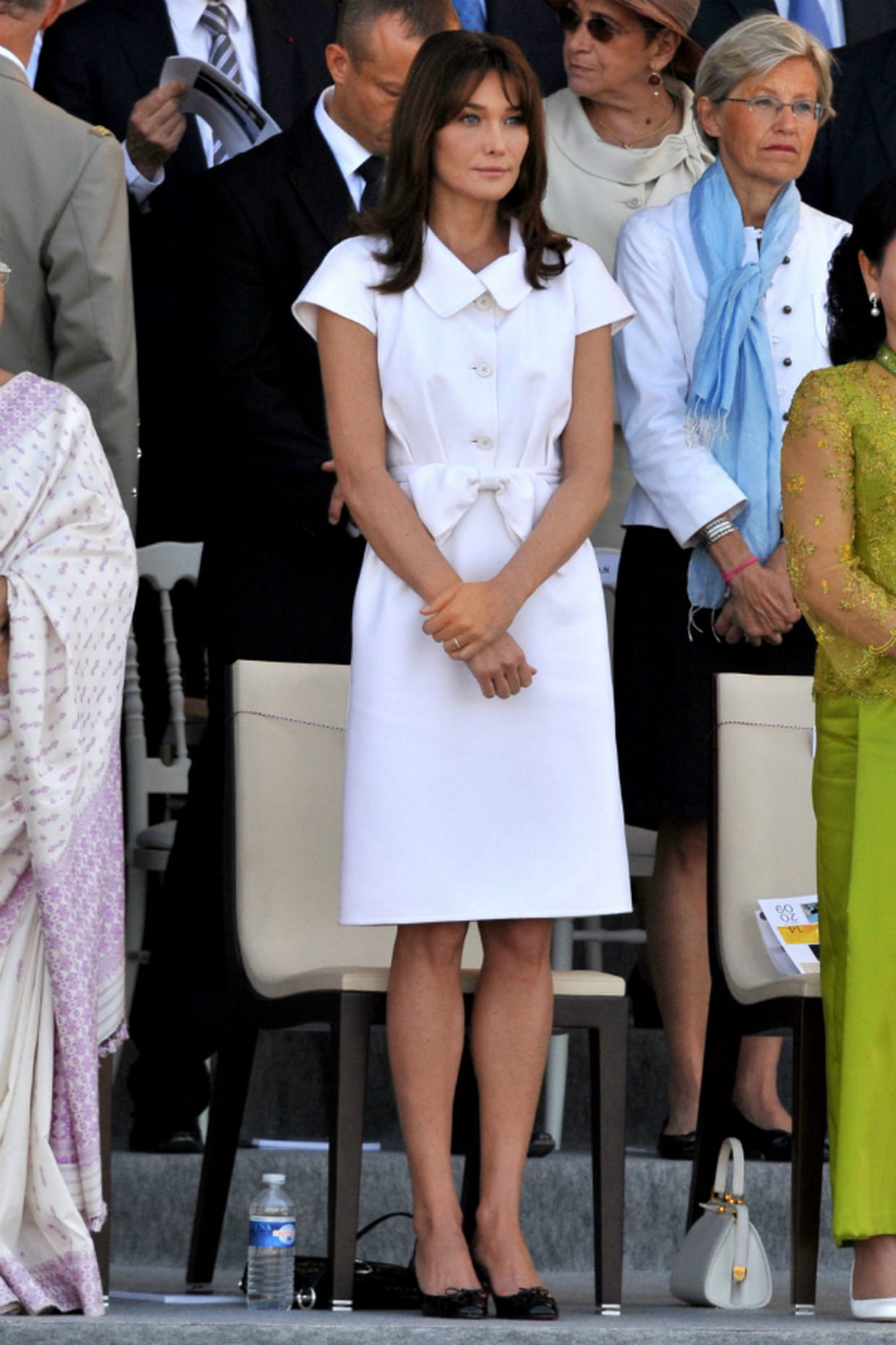 Carla Bruni en robe blanche col claudine à Paris le 14 juillet 2009.