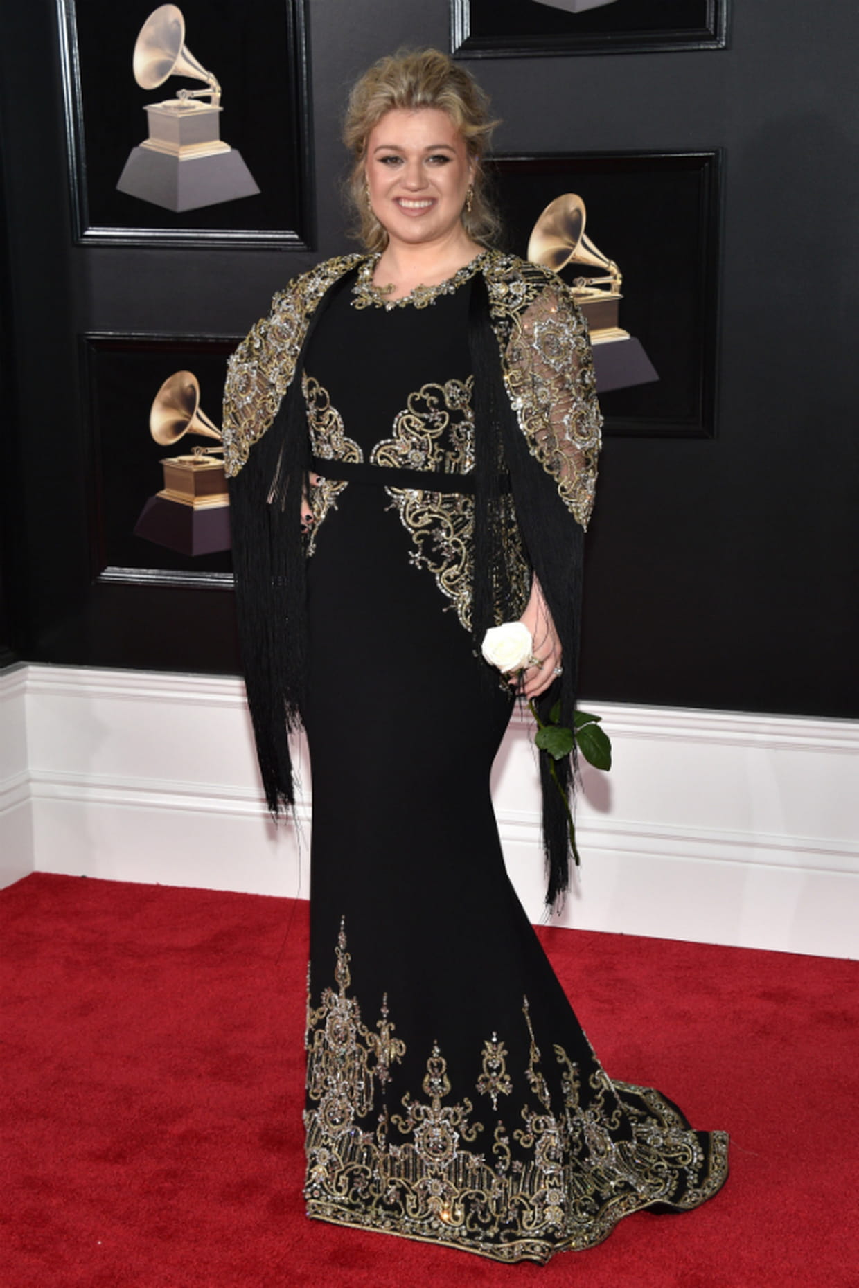 Kelly Clarkson en robe longue et cape à broderies dorées de Christian Siriano