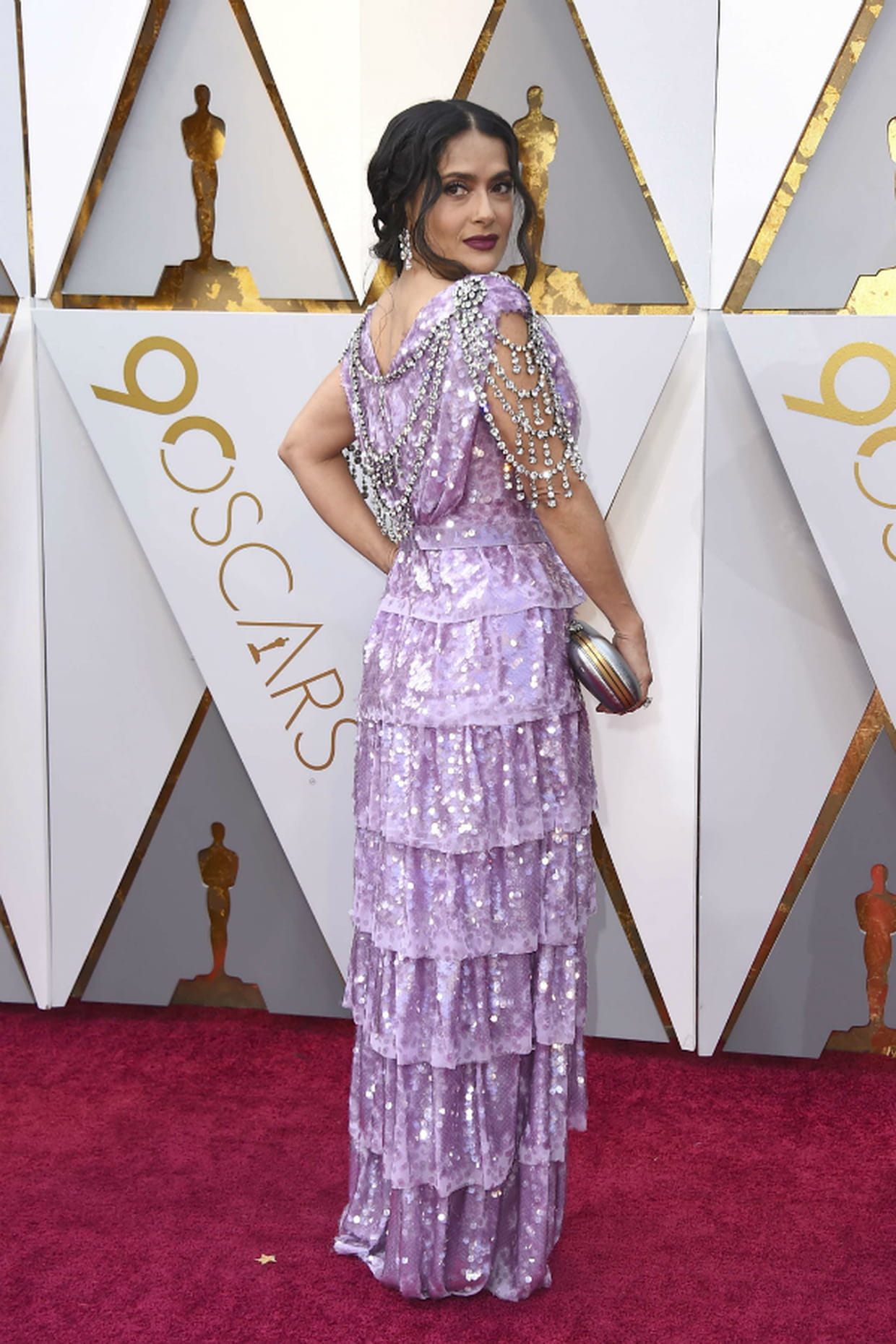 Salma Hayek à la cérémonie des Oscars 2018 en robe longue lavande à bijoux décoratifs signée Gucci