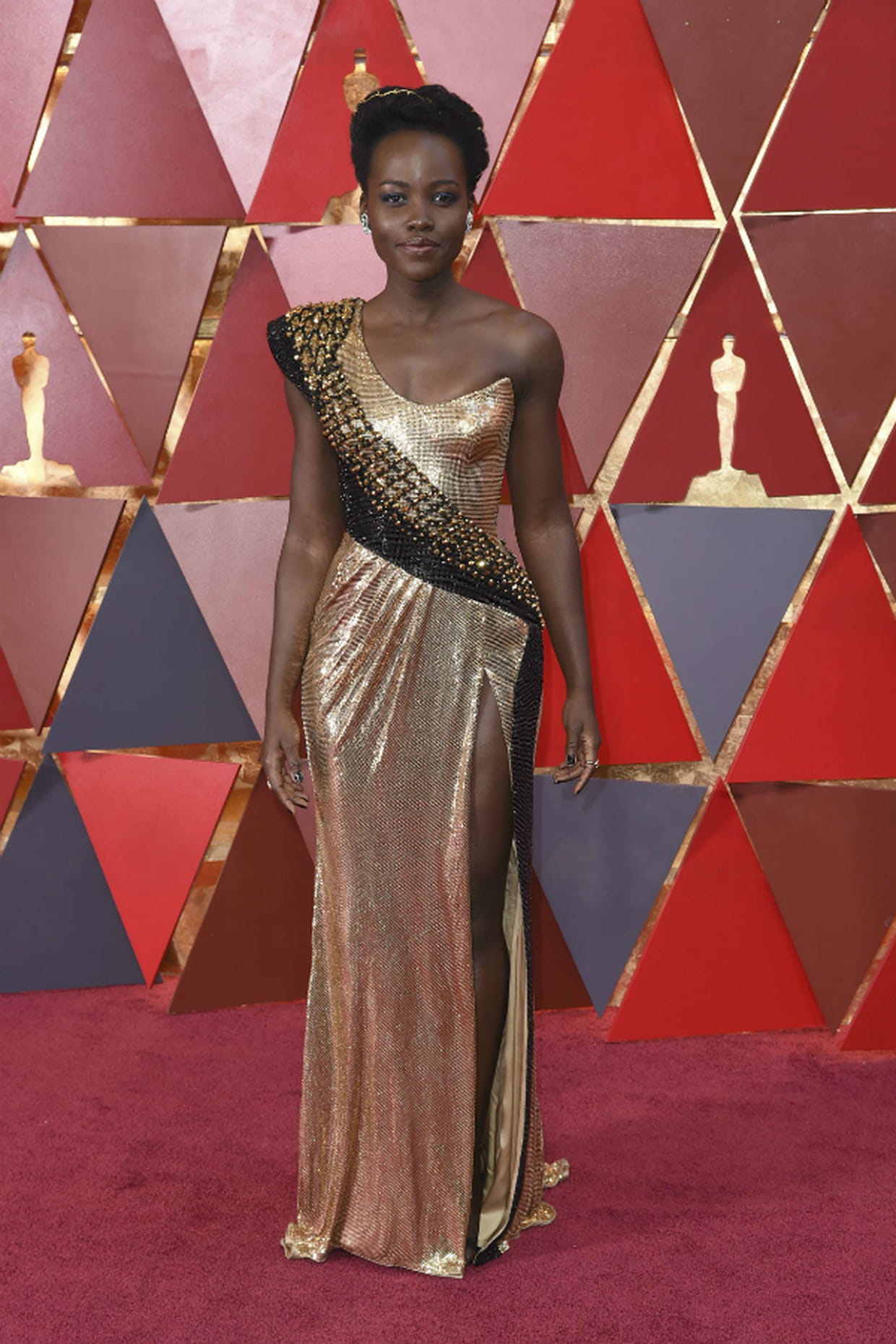 Lupita Nyong'o à la cérémonie des Oscars 2018 en robe longue lamée "one shoulder" signée Versace