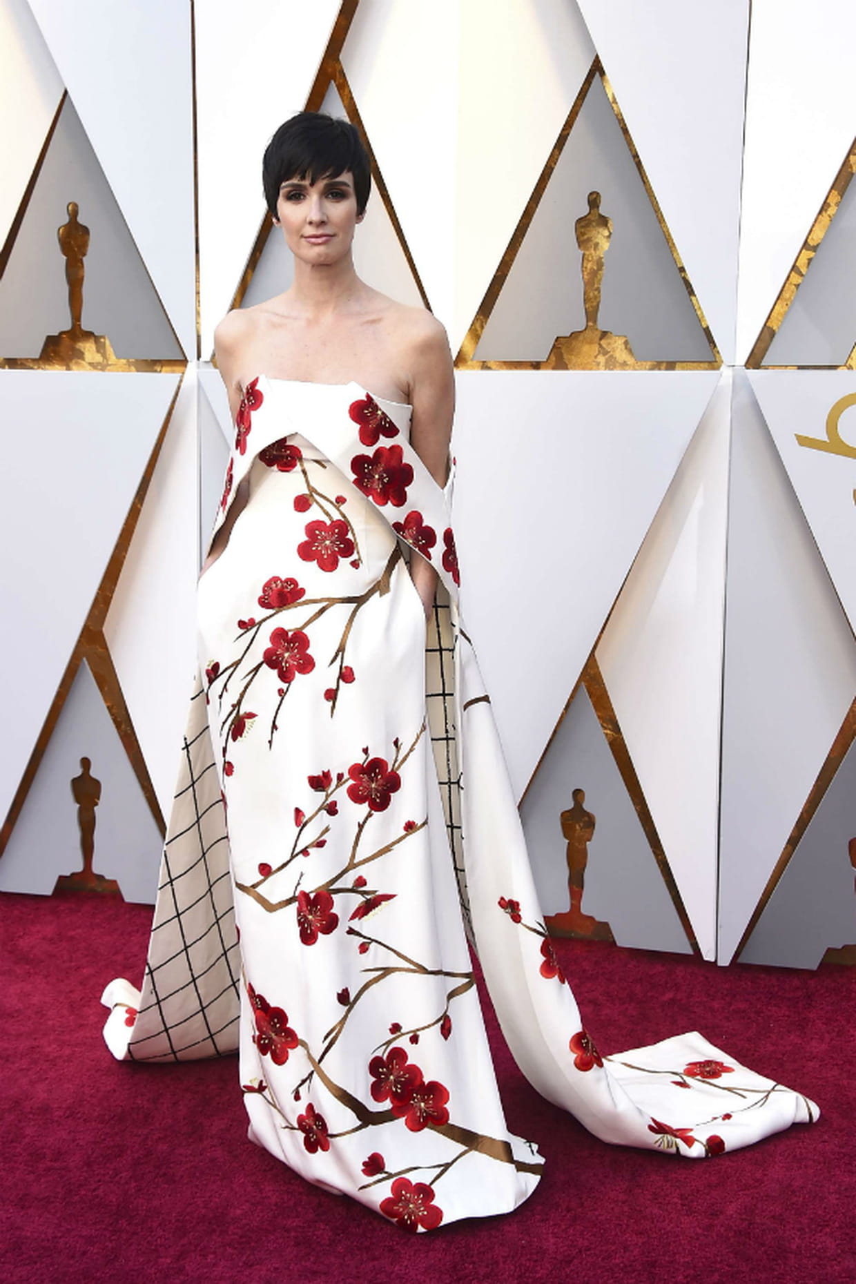 Paz Vega à la cérémonie des Oscars 2018 en robe bustier à fleurs et carreaux