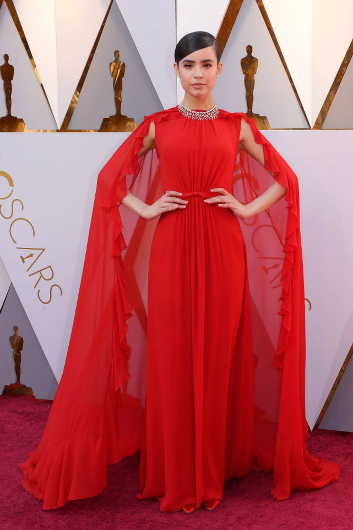 Sofia Carson à la cérémonie des Oscars 2018 en robe longue à cape rouge