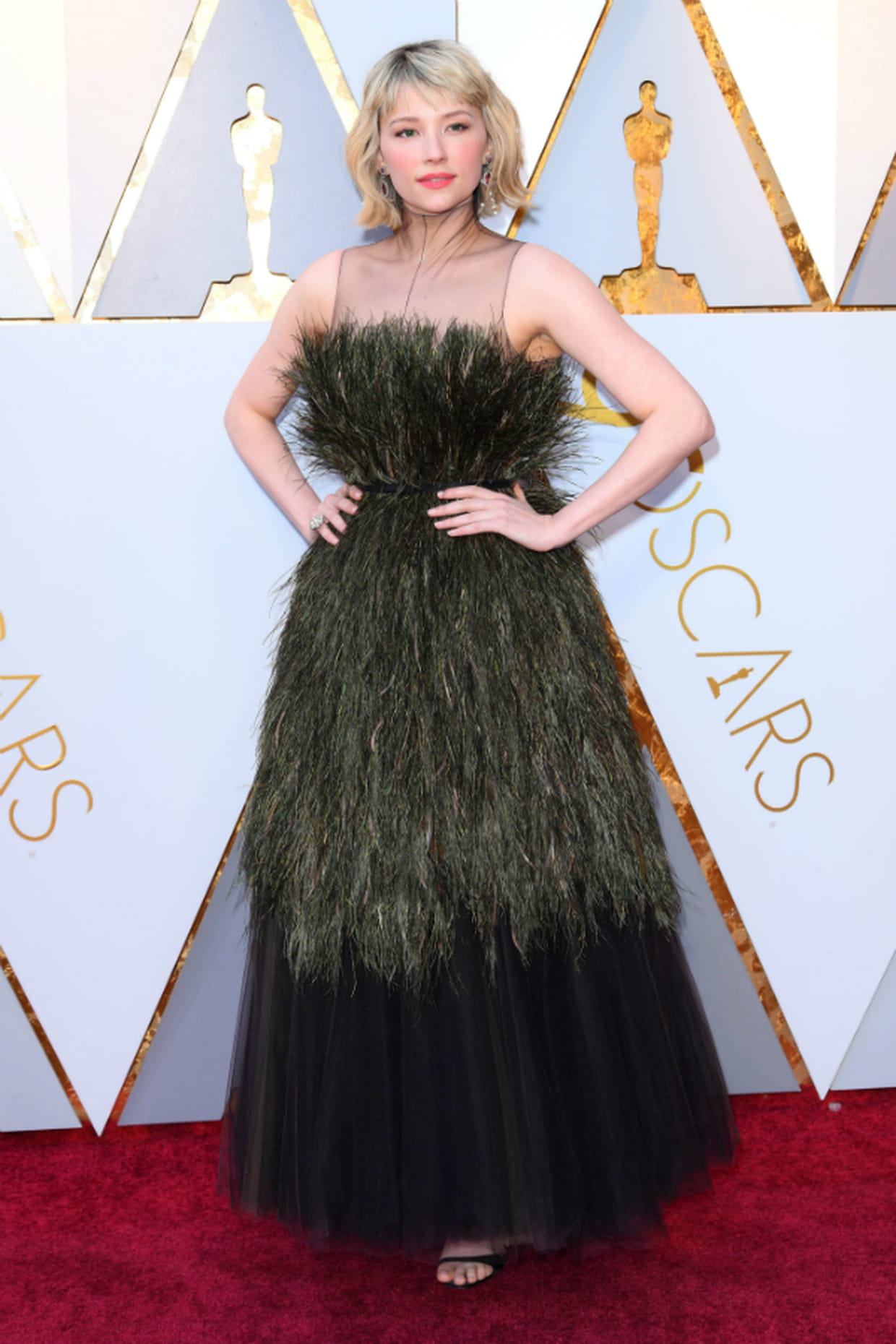Haley Bennett à la cérémonie des Oscars 2018en robe longue à plumes