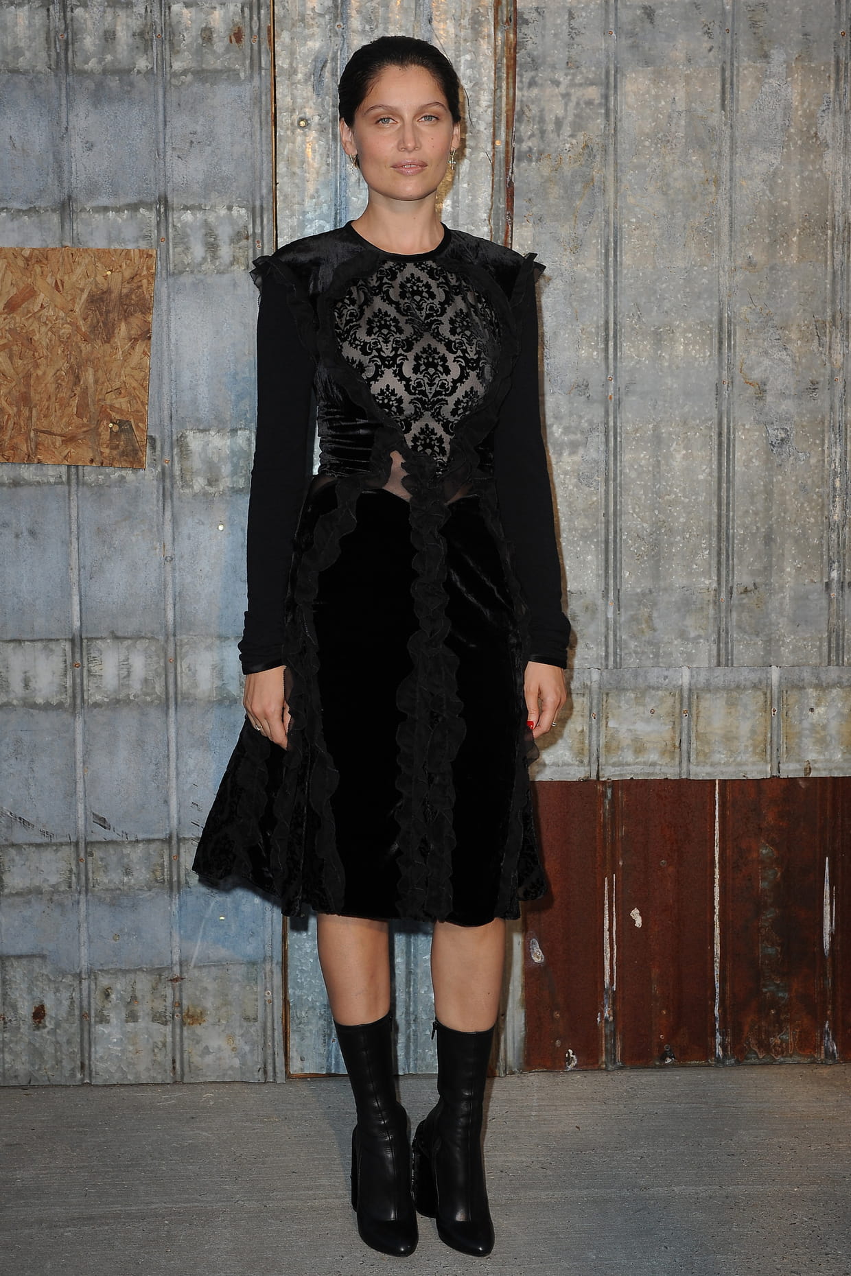 Laetitia Casta en robe midi noire en dentelle et bottines en cuir au défilé Givenchy pendant la fashion week printemps-été 2015-2016 à New York le 11 septembre 2015.