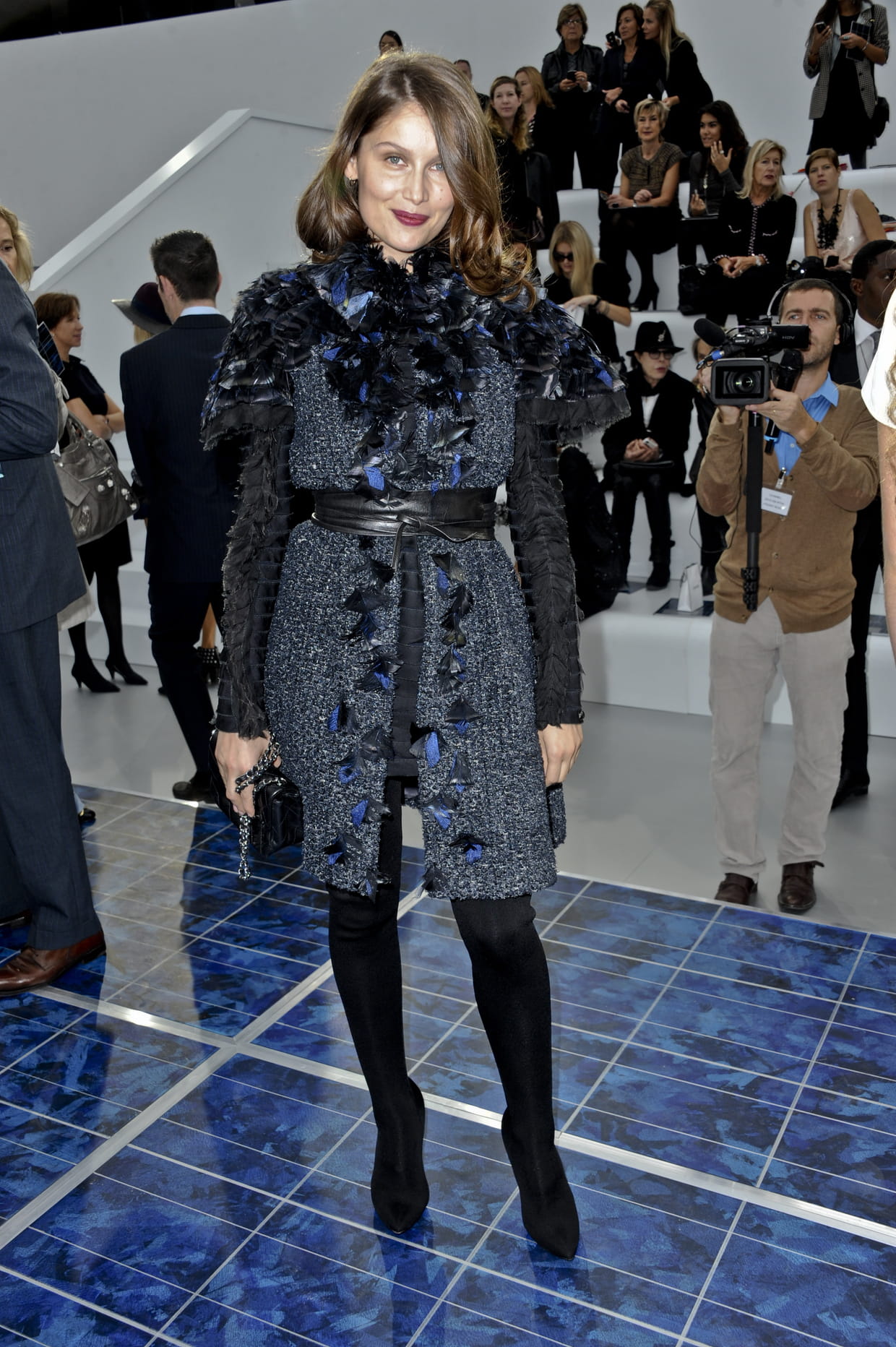 Laetitia Casta en manteau en tweed et bottes noires Chanel au défilé Chanel pendant la fashion week printemps-été 2012-2013 à Paris le 2 octobre 2012.