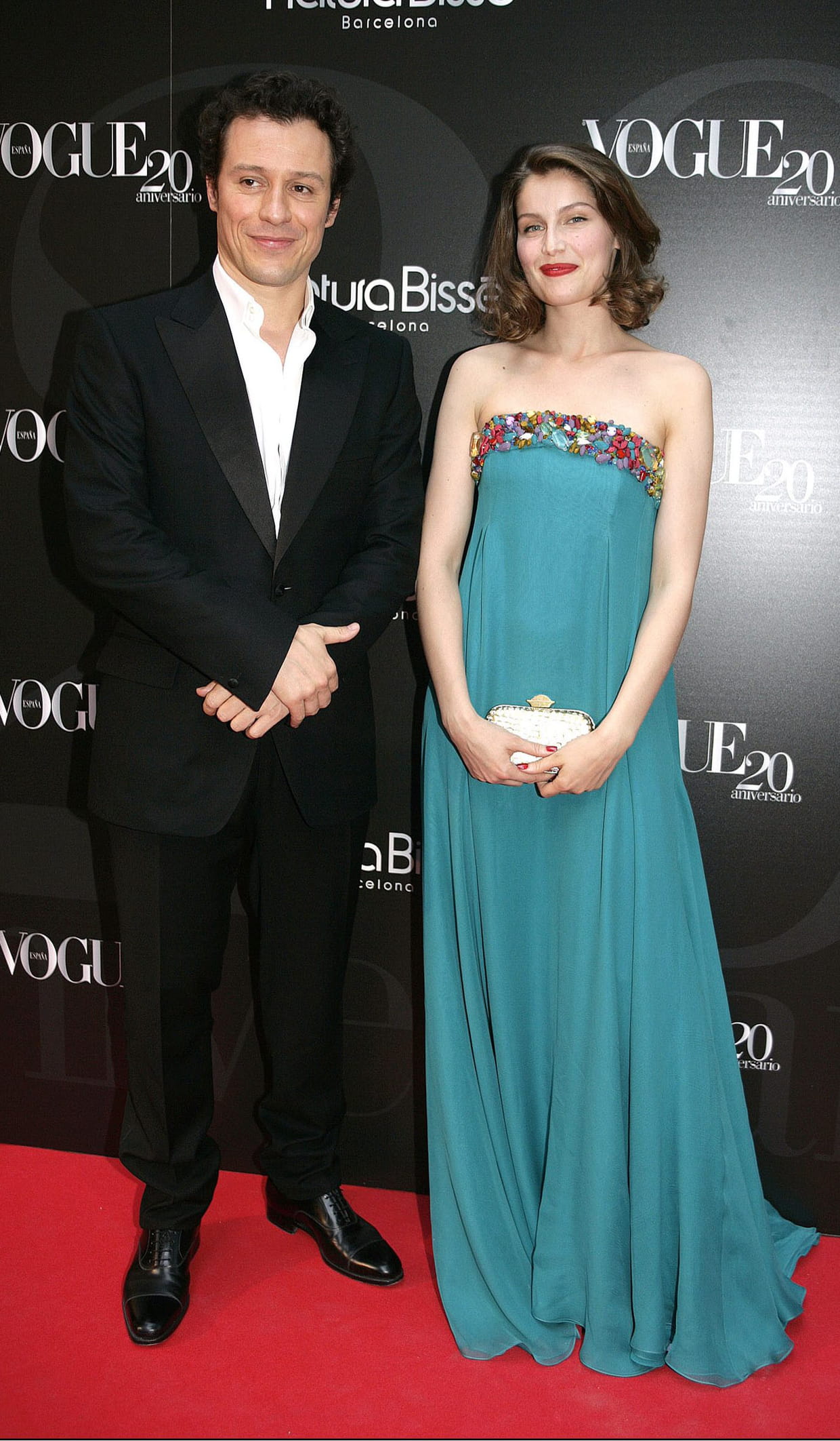 Laetitia Casta en robe bleue à bustier strassé avec Stefano Accorsi à la soirée d'anniversaire des 20 ans du magazine Vogue España à Madrid le 25 juin 2008.