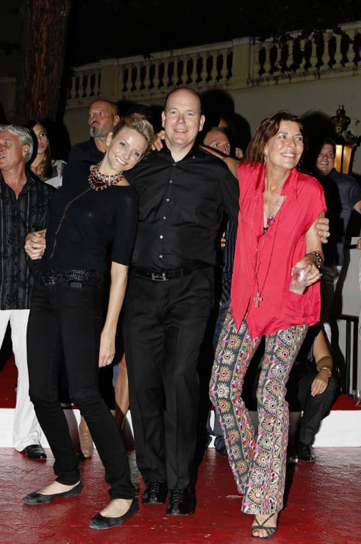 Caroline de Monaco en pantalon flare avec Charlène Wittstock et Albert II au concert en plein air d'Iggy Pop au palais royal à Monaco le 5 juillet 2010.