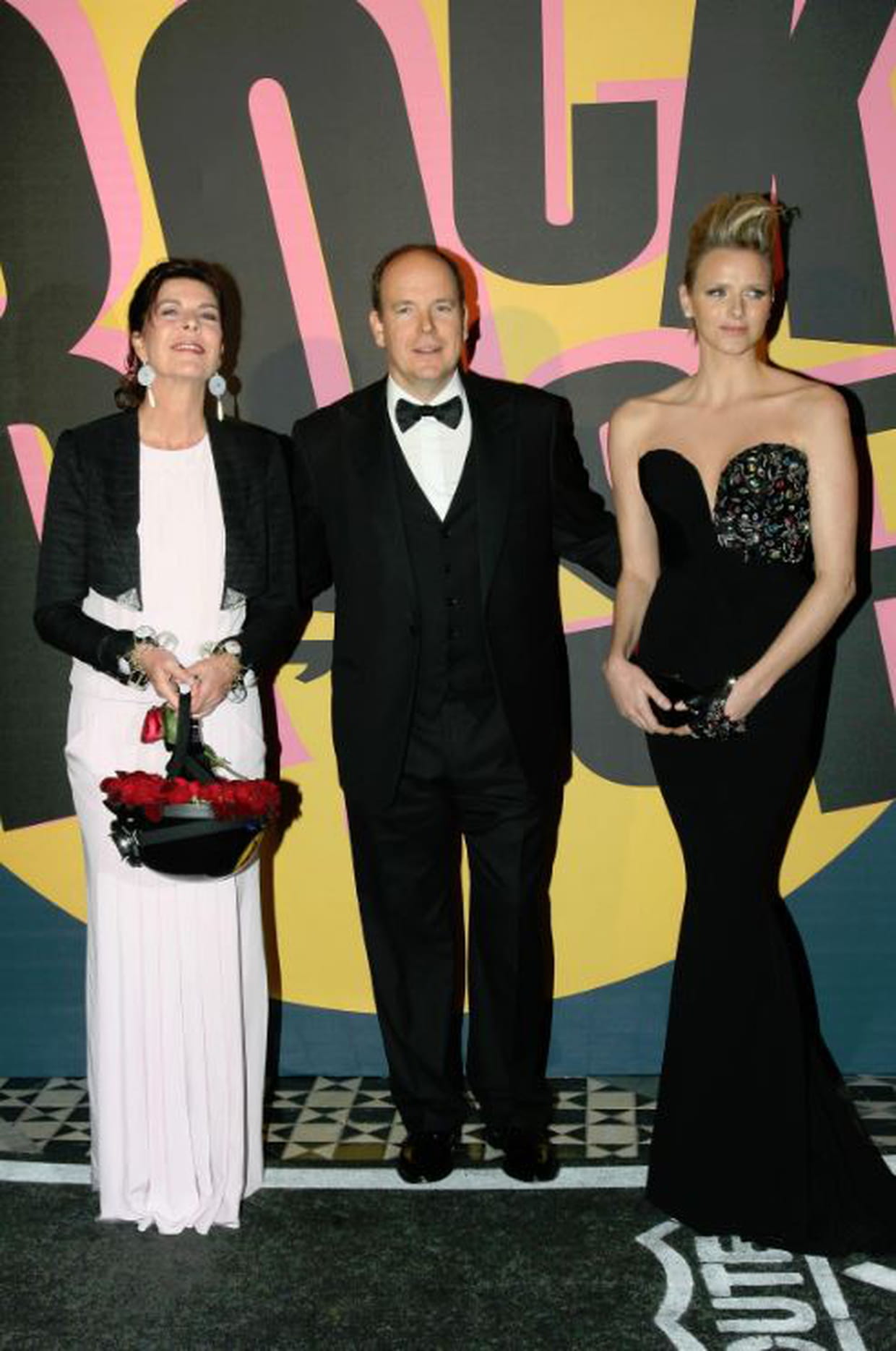 Caroline de Monaco en longue robe de gala avec Albert II et Charlène Wittstock au 55ème Bal de la Rose à Monaco le 28 mars 2009.