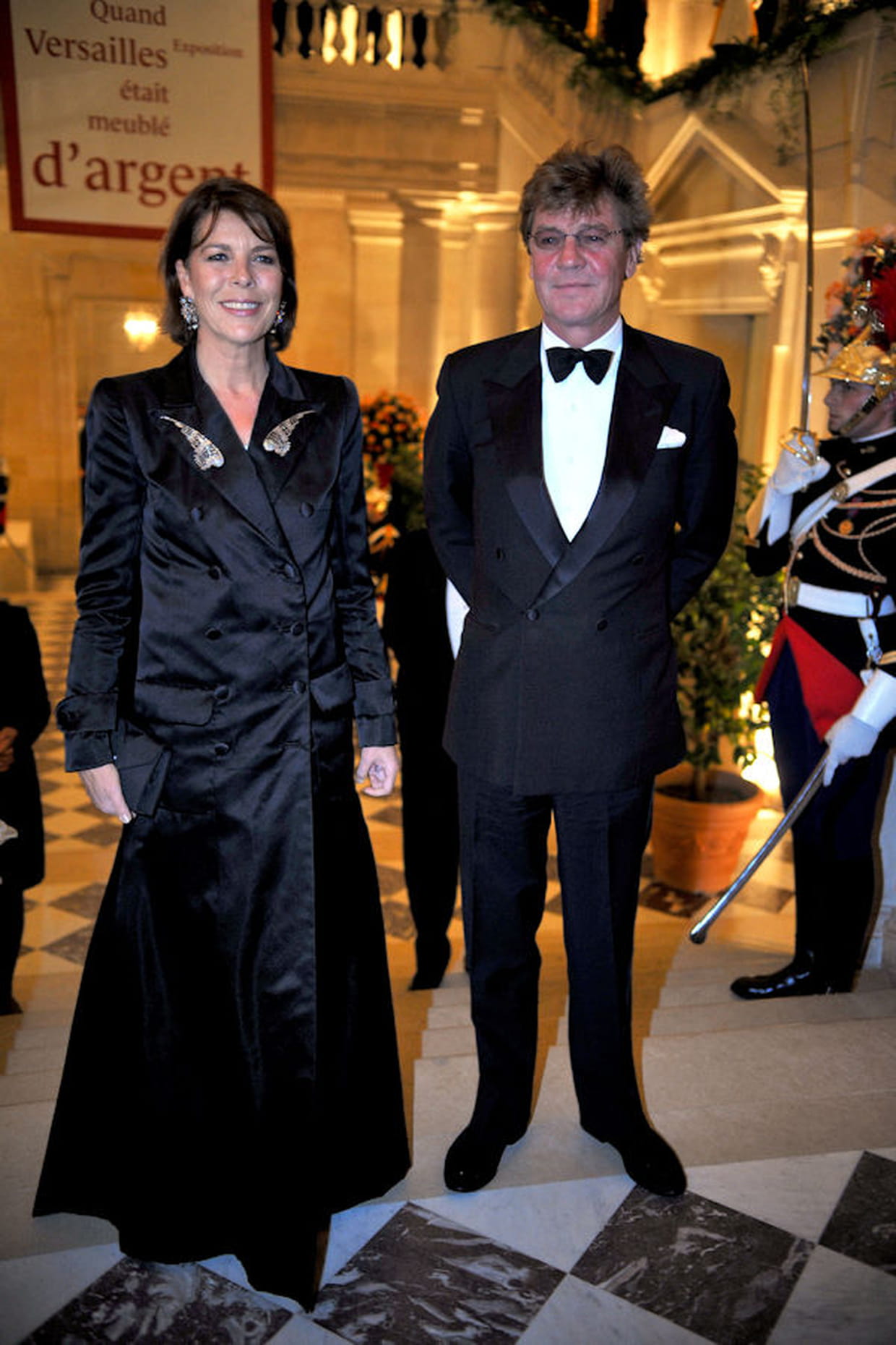 Caroline de Monaco en robe blazer longue avec le prince Ernst August lors de l'exposition Quand Versailles était meublé d'argent au château de Versailles le 19 novembre 2007.
