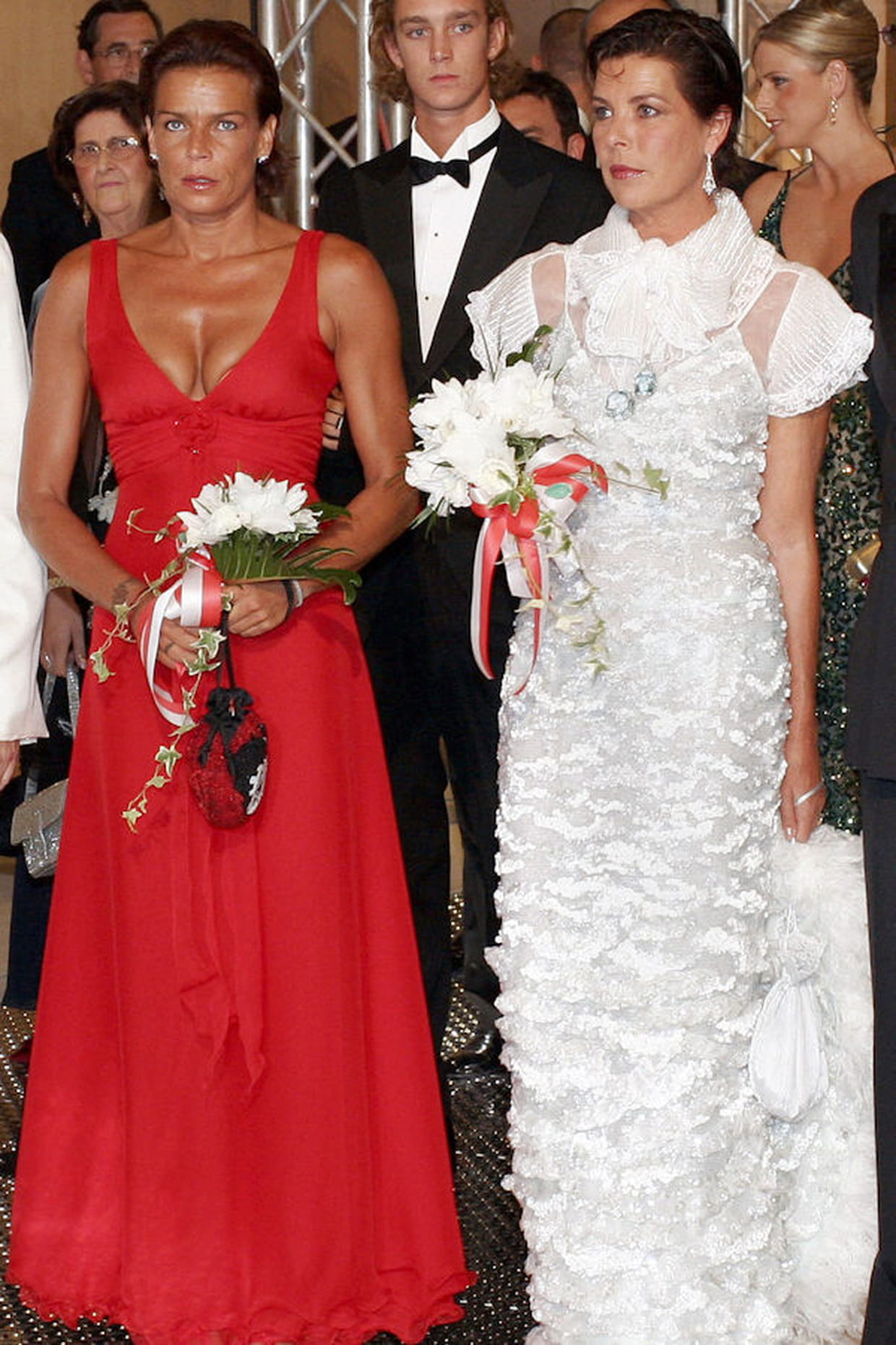 Caroline de Monaco en robe blanche à volants avec Stéphanie de Monaco lors du 58ème Bal de la Croix Rouge au Sporting de Monte-Carlo le 5 août 2006.