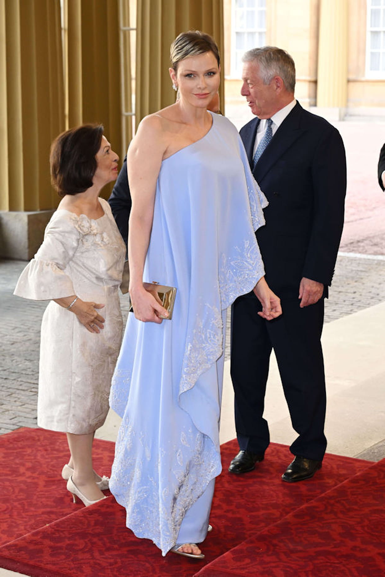 Charlène de Monaco en ensemble fluide à volants asymétrique lors d'une réception au palais de Buckingham à Londres le 5 mai 2023.