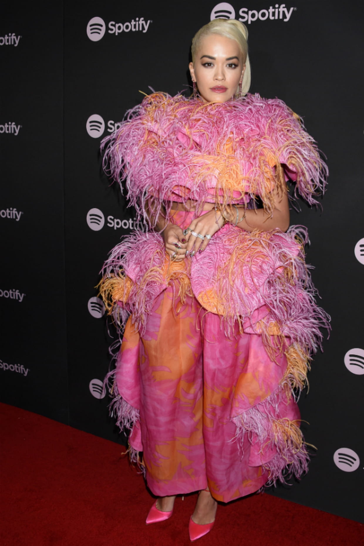 Rita Ora en robe tout en volume et plumes à la soirée Spotify à Los Angeles le 7 février 2019