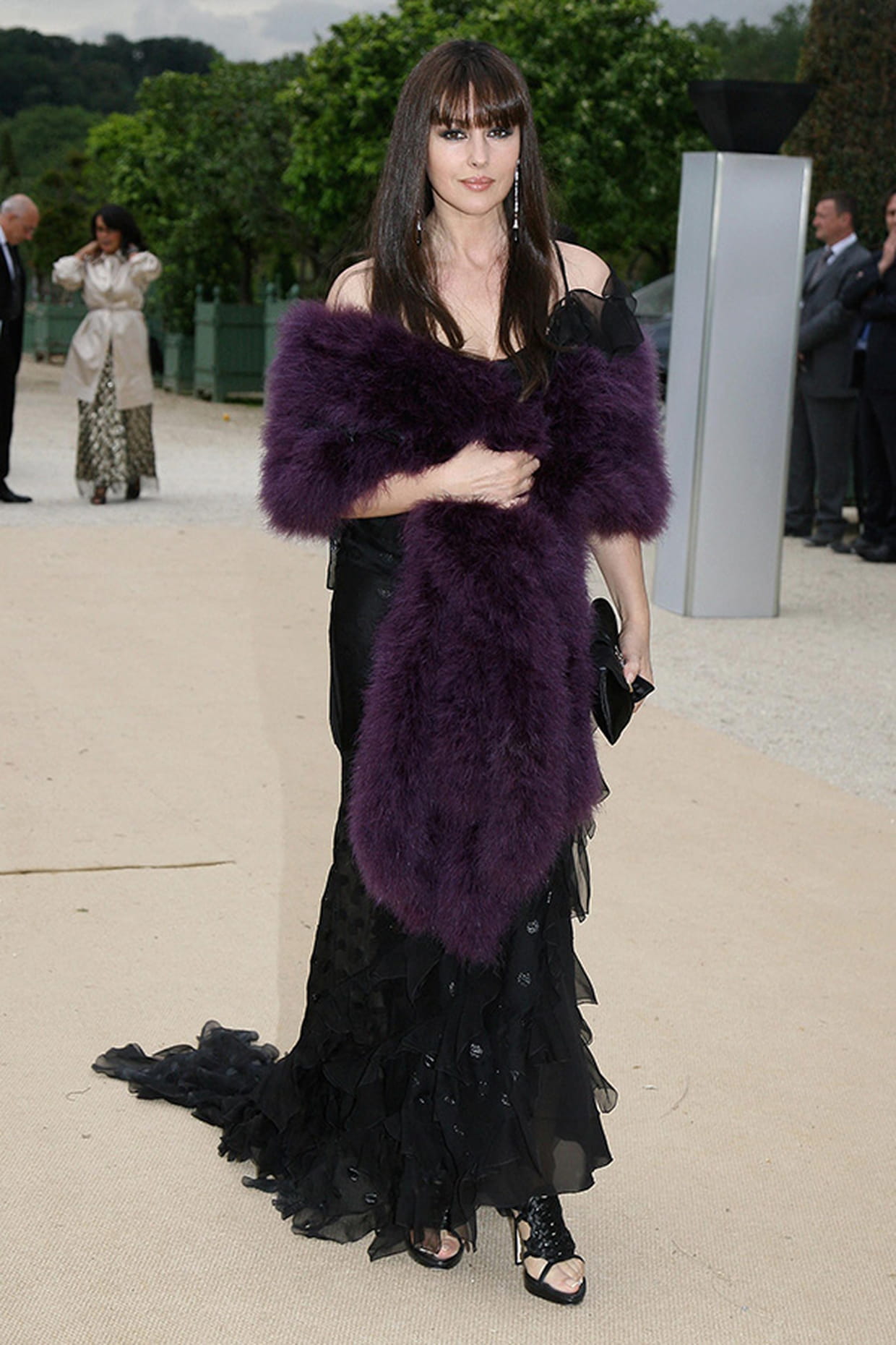Monica Bellucci en robe noire à traîne et fourrure violette Dior