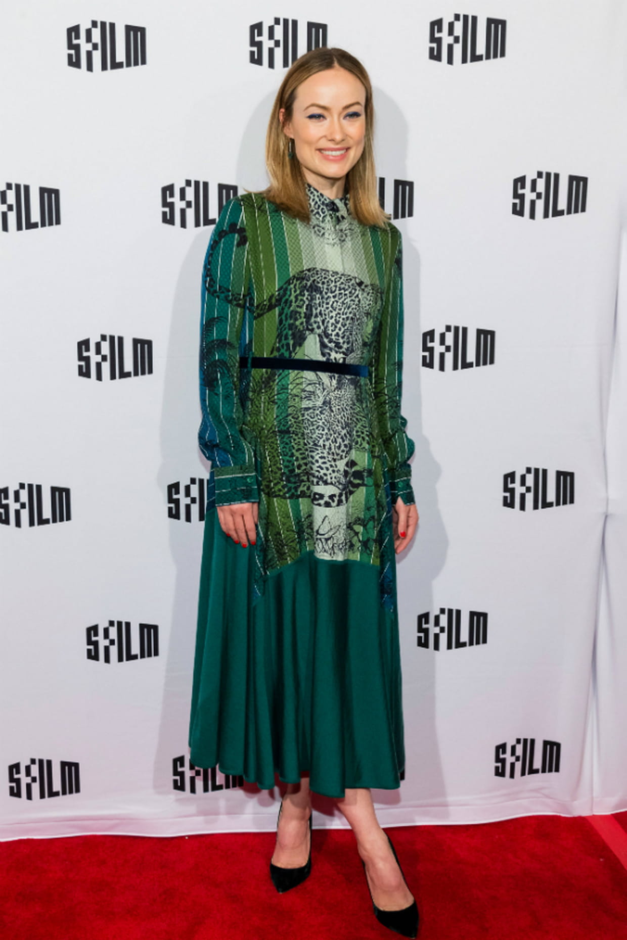 Olivia Wilde en robe plissée imprimée le 16 avril 2019 à une avant première à San Francisco