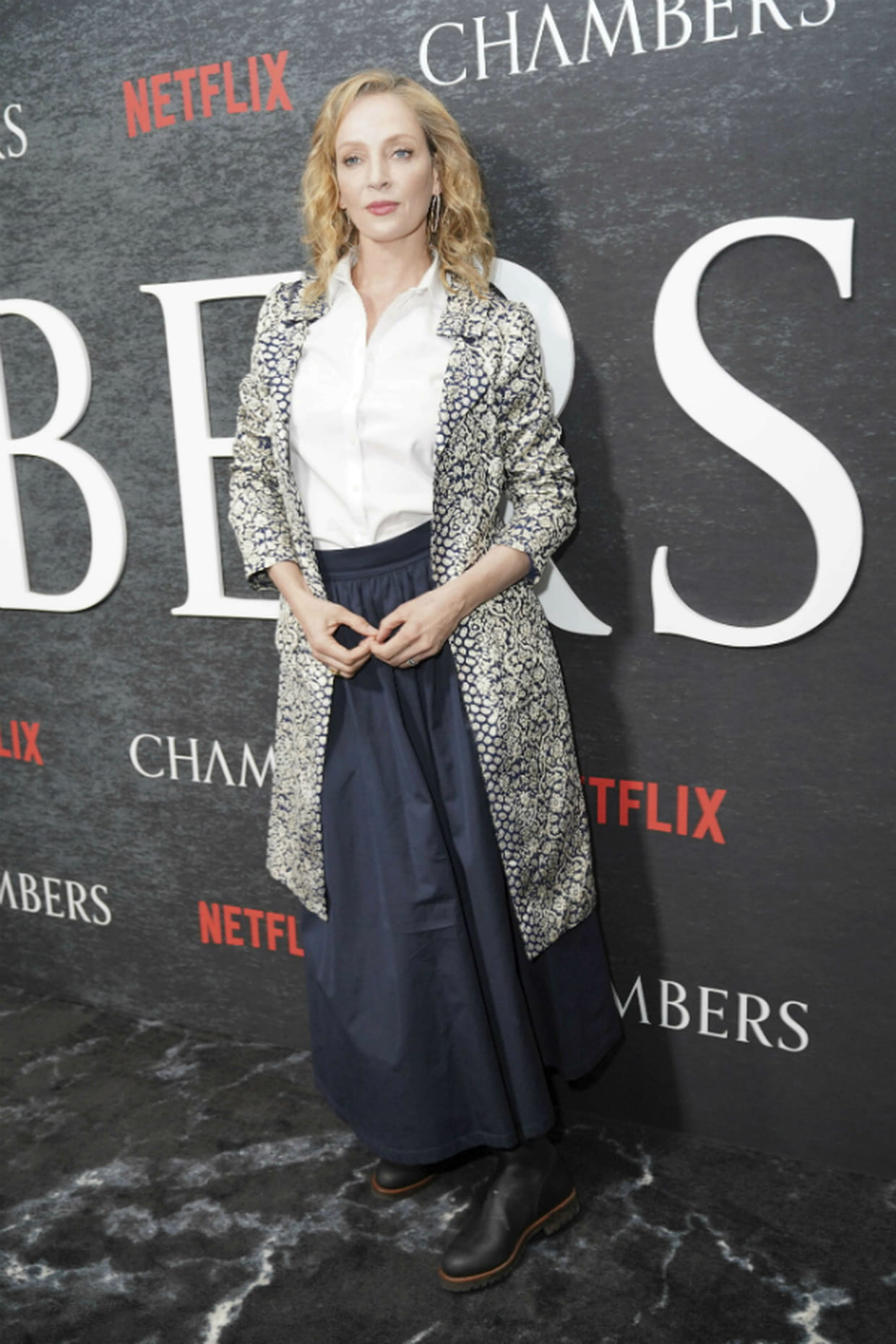 Uma Thurman en total look oversize à la première de Chambers à New York le 15 avril 2019