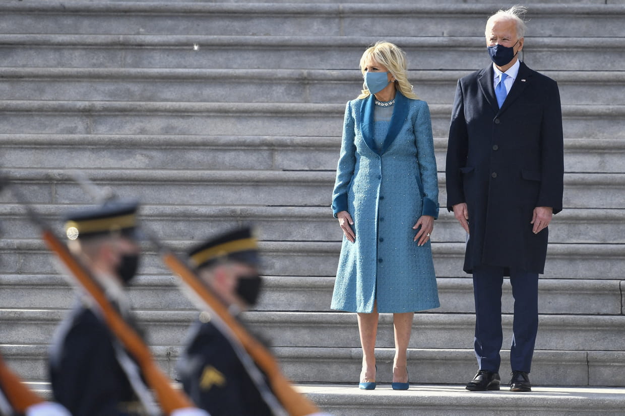L'épouse de Joe Biden, Jill Biden a créé la surprise pour l'investiture de son époux. Non pas pour la forme de sa tenue relativement classique, une robe cintrée assortie d'un manteau parsemé de cristaux Swarovski dans un ton bleu ciel, mais bien pour son choix de designer. Ecartant de la main les grands noms installés de la mode américaine, la désormais First Lady s'est tournée vers Alexandra O'Neill, créatrice de la jeune marque Markarian lancée 2017, affirmant ainsi son soutien à la jeune scène mode étasunienne. Joe Biden, lui, était habillé par l'illustre Ralph Lauren.