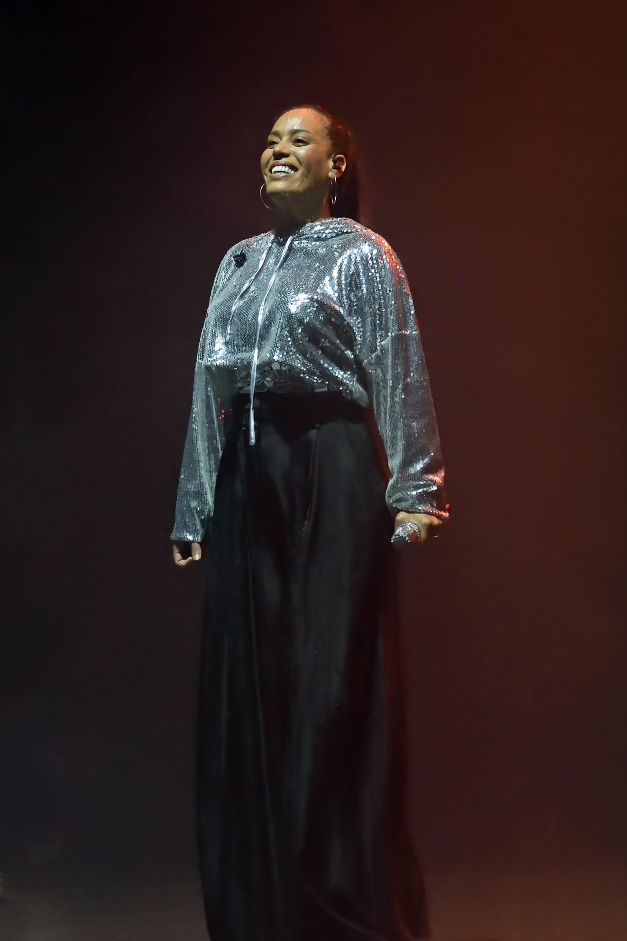 Amel Bent en chemise métallisée et pantalon noir ample en concert à Paris le 26 juin 2019.