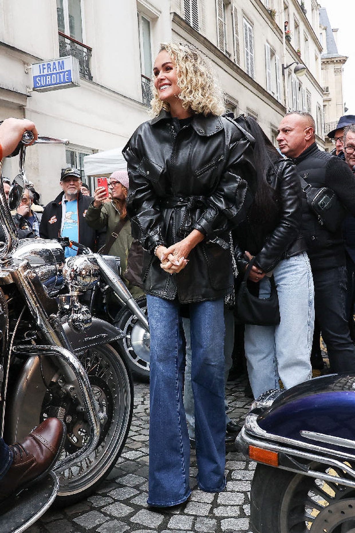 Læticia Hallyday en veste oversize en cuir noir et jean flare bleu