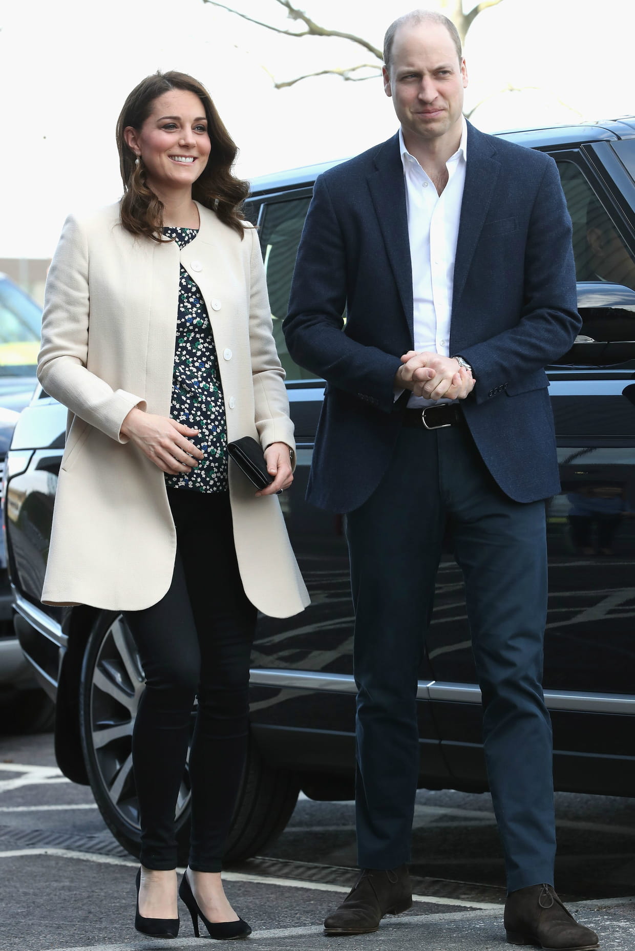 Kate Middleton en jean noir et veste beige avec le prince William à Londres le 22 mars 2018.