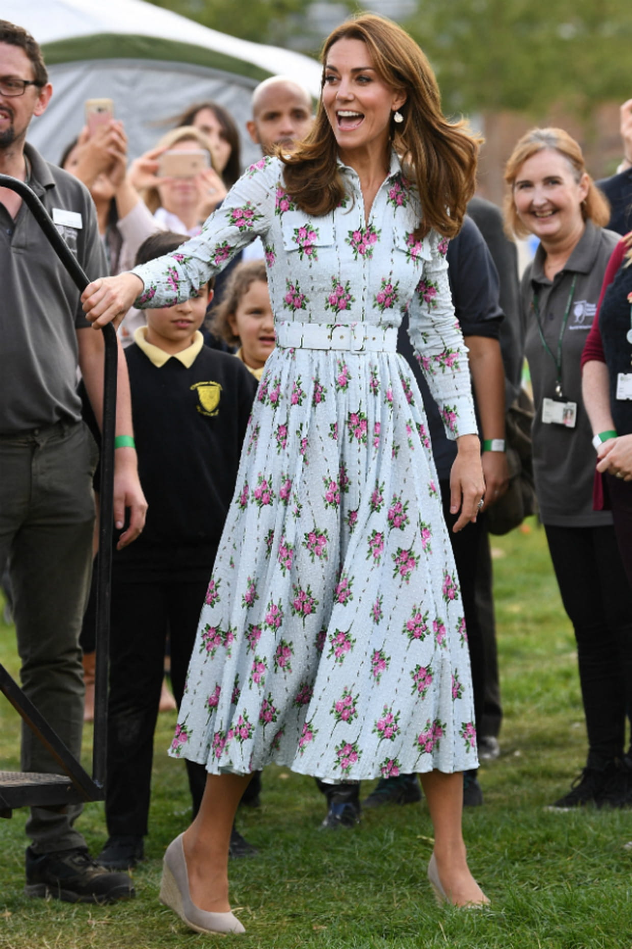 Kate Middleton en robe bleue à fleurs roses au festival Back To Nature à Surrey le 10 septembre 2019.