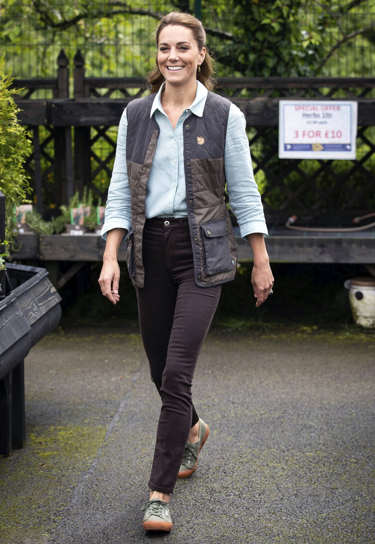 Kate Middleton en chemise et veste sans manches au centre de jardinage de Fakenham le 18 juin 2020.