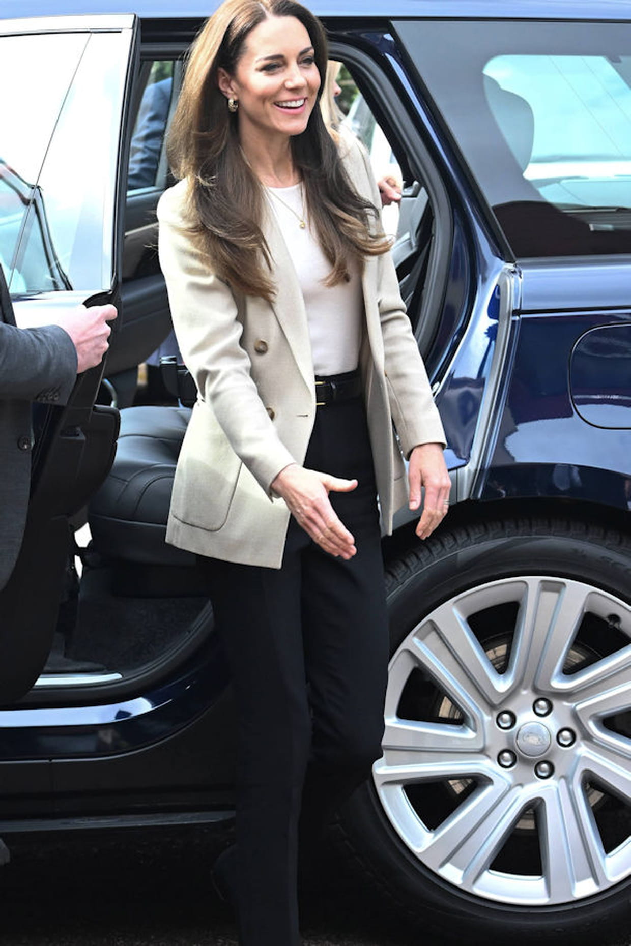 Kate Middleton en blazer beige Reiss et pantalon noir LK Bennett