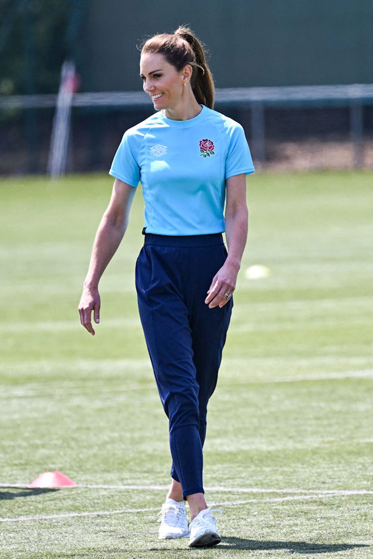 Kate Middleton en T-shirt bleu clair et jogging bleu marine lors d'une rencontre sportive avec l'équipe du Maidenhead Rugby Club dans le Berkshire le 7 juin 2023.