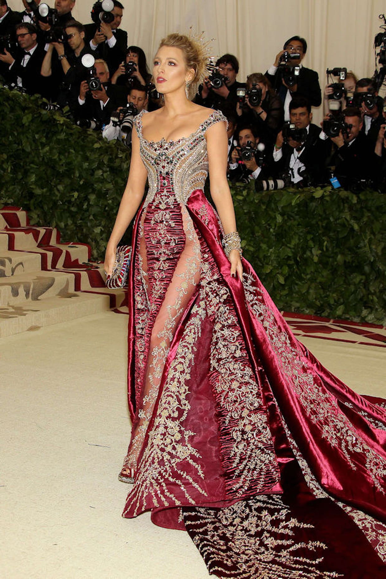 Blake Lively en robe ornée d'or et de rubis signée Versace pour le Met Gala 2018.