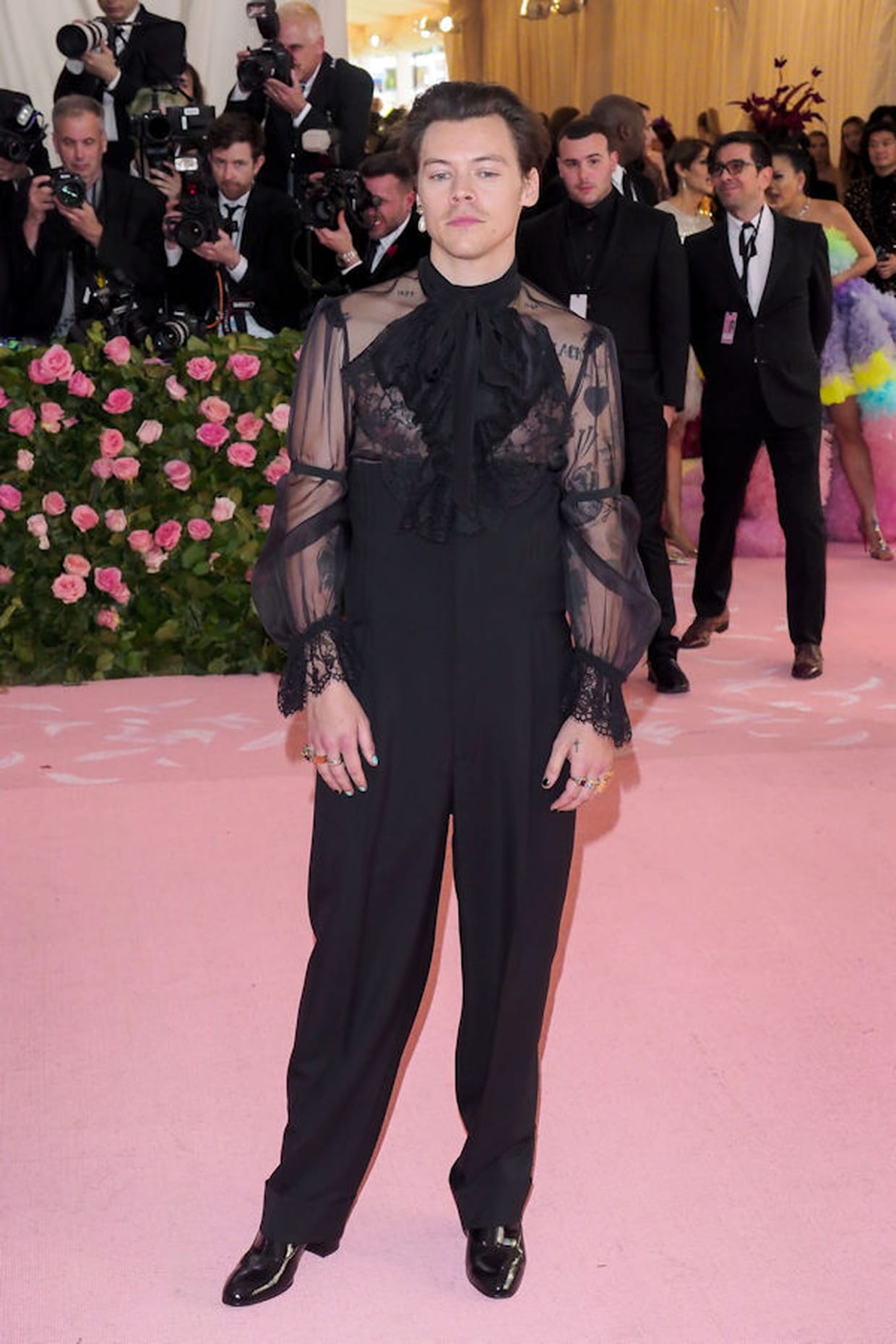 Harry Styles en total look noir Gucci pour le Met Gala 2019.