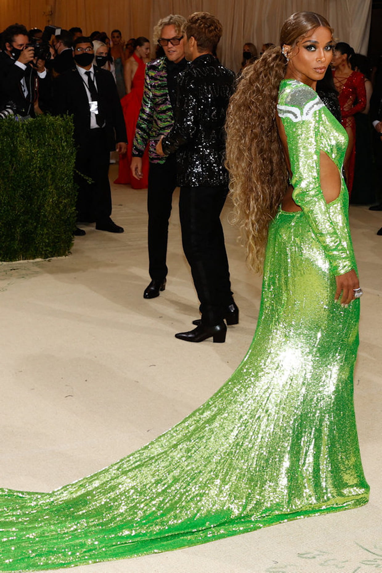 Ciara en robe vert métallisé Dundas au Met Gala à New York le 13 septembre 2021.