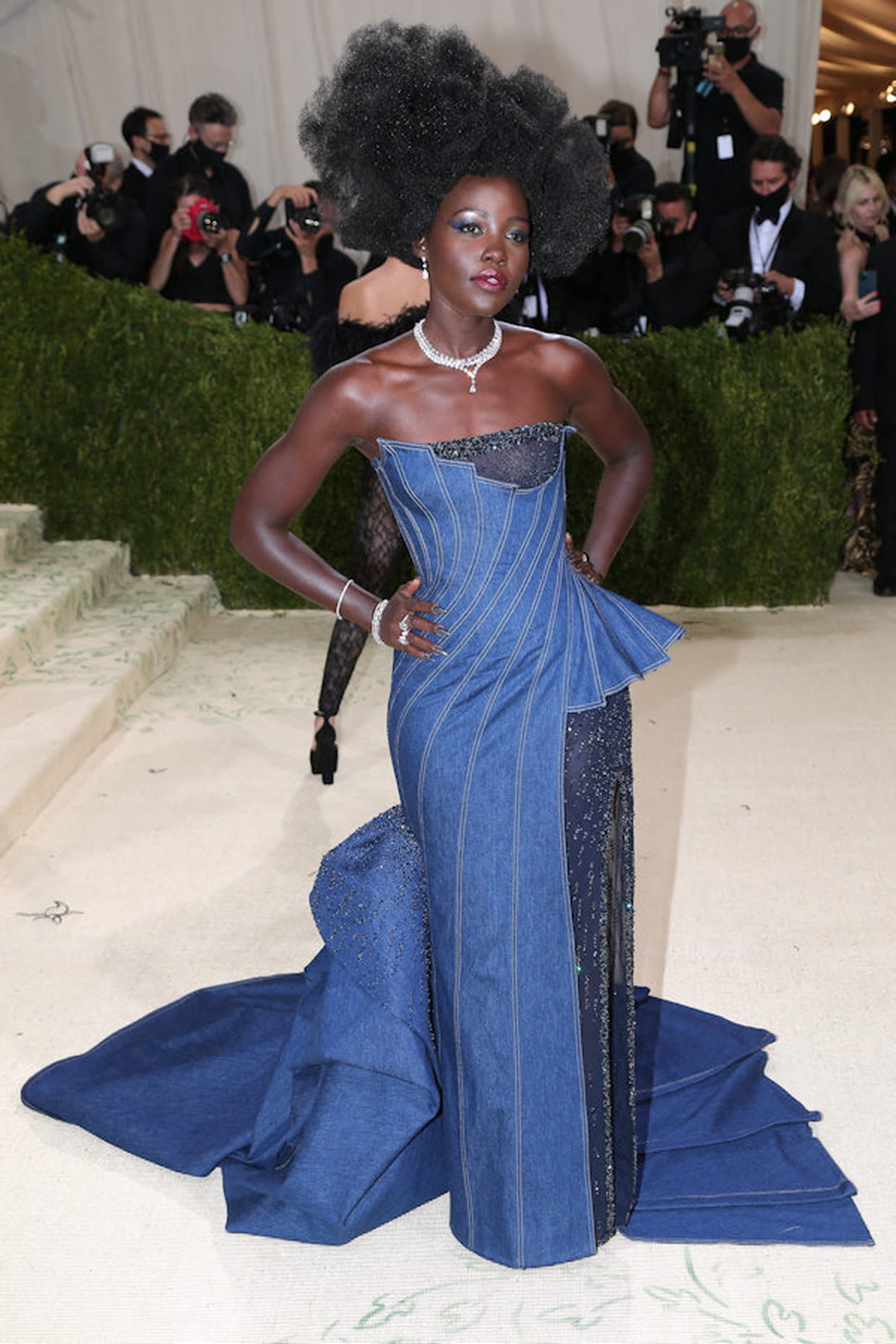 Lupita Nyong'o en robe bustier en jean Versace au Met Gala à New York le 13 septembre 2021.