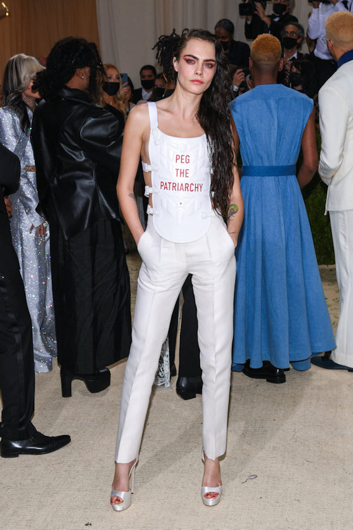 Cara Delevingne en ensemble blanc Dior au Met Gala à New York le 13 septembre 2021.