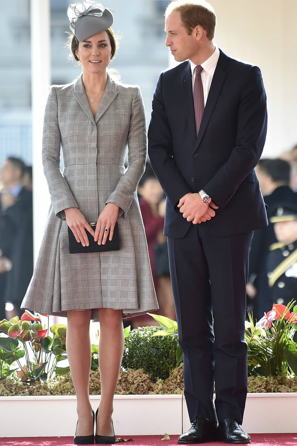 Kate Middleton en manteau à carreaux Alexander McQueen et chapeau coordonné avec le prince William pour accueillir le président de Singapour Tony Tan Keng Yam à Londres le 21 octobre 2014.