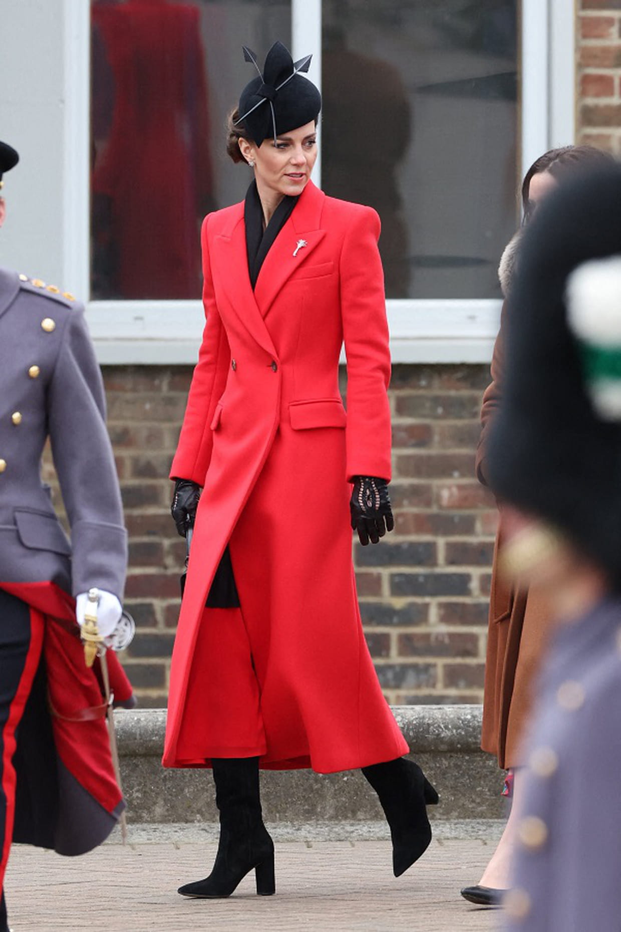Kate Middleton en manteau en laine Alexander McQueen et bottes en daim Gianvito Rossi en visite au premier bataillon des Gardes gallois à Windsor le 1er mars 2023.