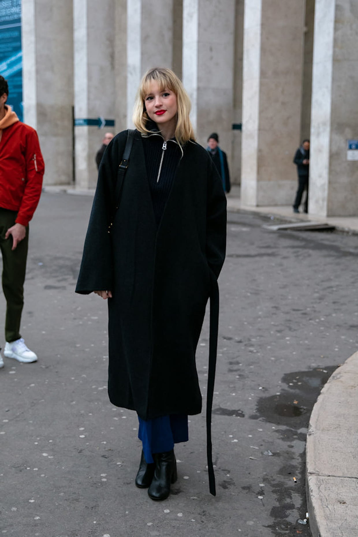 Angèle en long manteau noir au défilé Acne Studios printemps-été 2019 le 20 janvier 2019.
