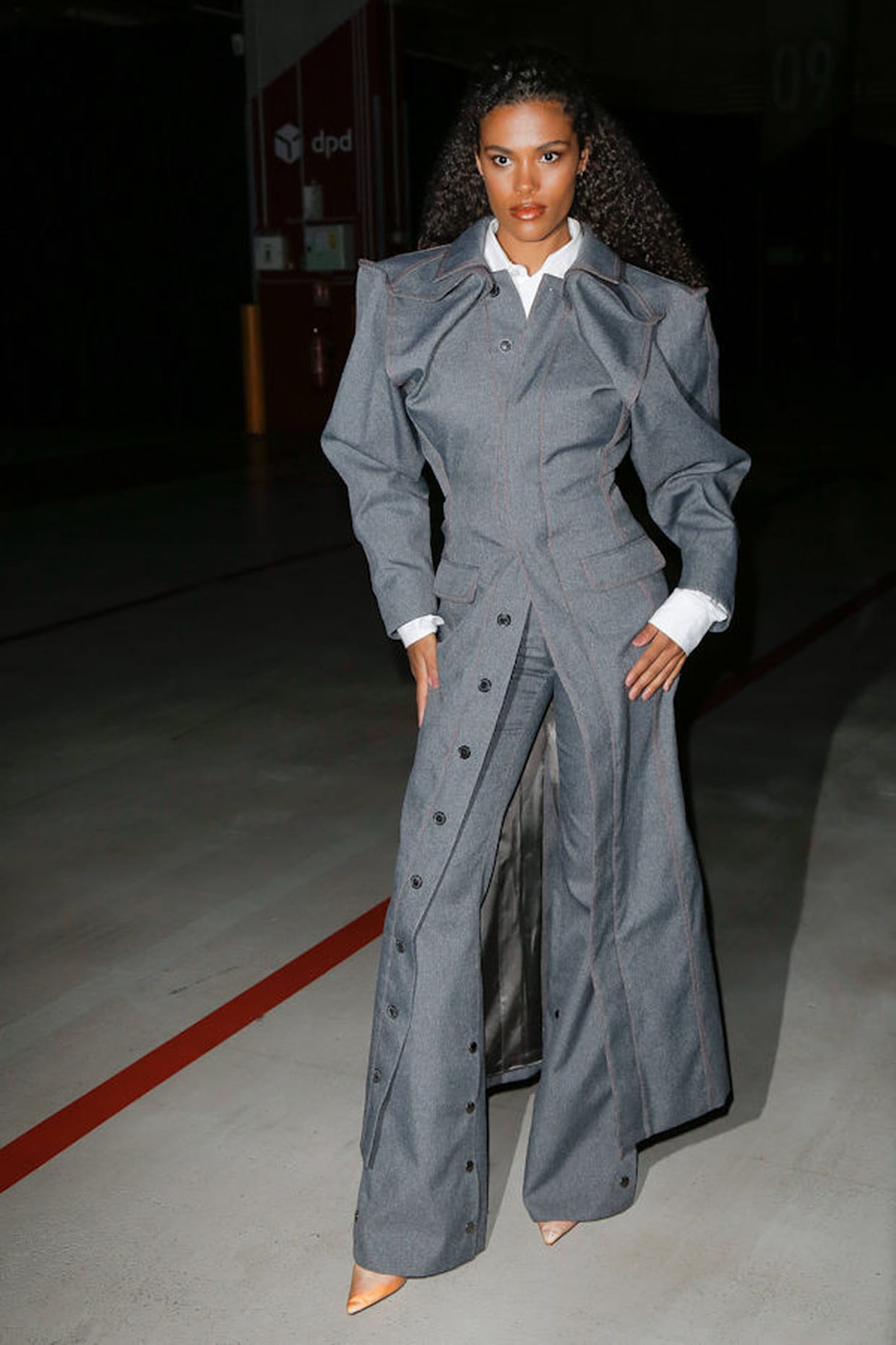 Tina Kunakey en ensemble gris chiné à boutons Y/Project au défilé Y/Project pendant la fashion week homme automne-hiver 2022-2023 à Paris le 19 janvier 2022.